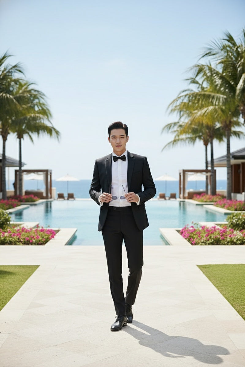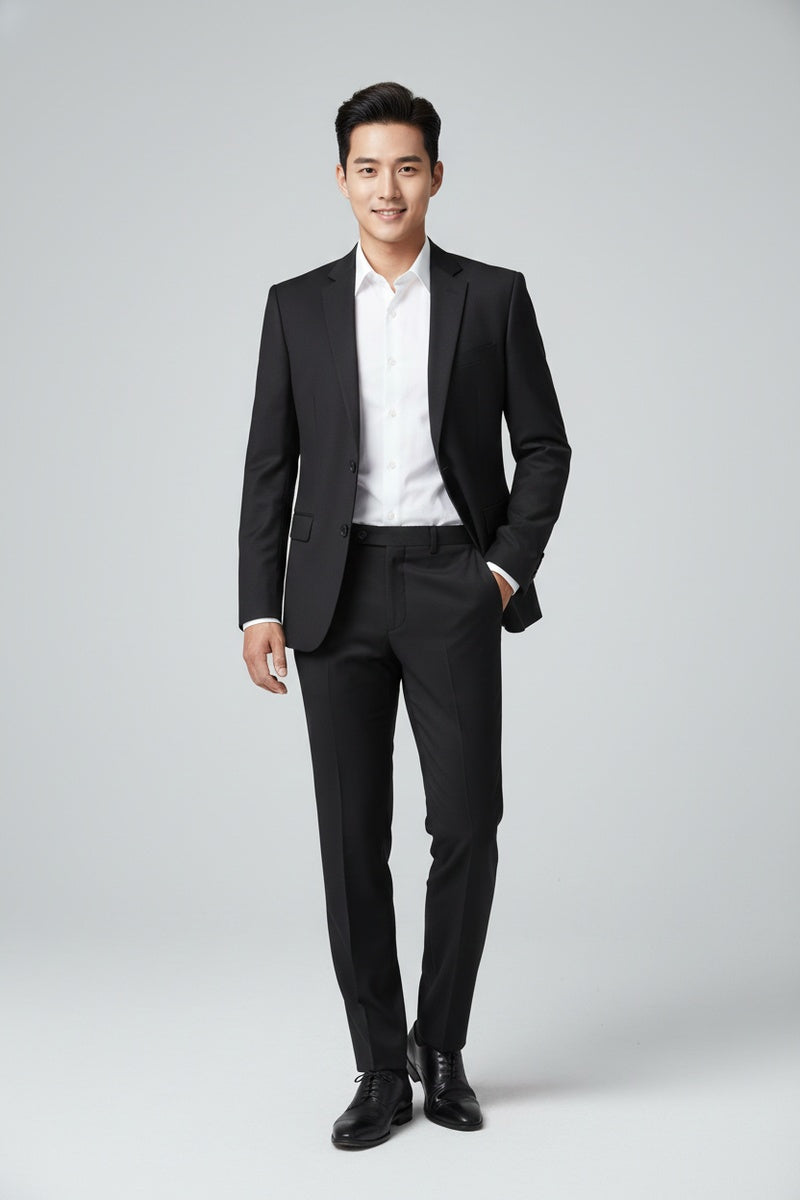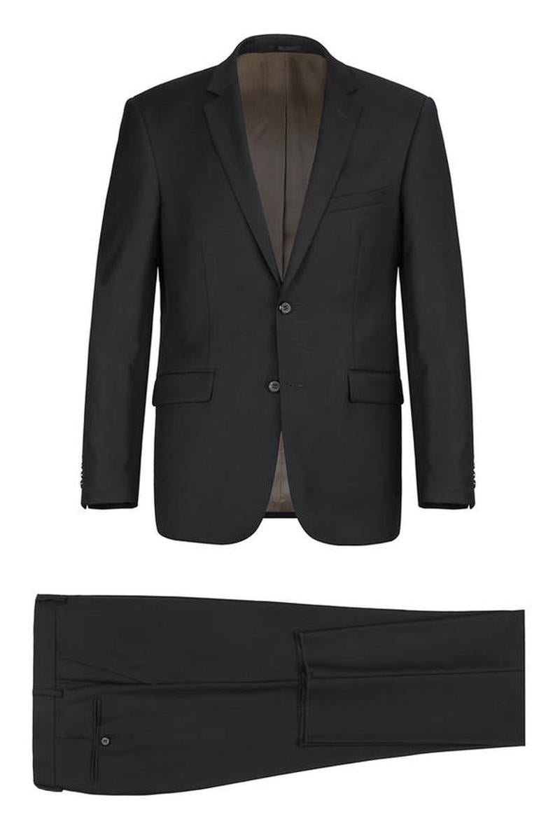 The Black Solid 2-Button Notch Suit, designed by Alessandro Vitello, is hand-tailored in either a signature classic fit or slim fit and crafted using a wool stretch fabric. The front of the jacket features notch lapels. The front enclosure features two buttons and dual lower front besom pockets. A top welt pocket is located on the left side of the jacket to properly store a pocket square. Darts stitched down the front of the jacket are tailored to perfection giving a desired tapered shape to the garment. Towards the cuff of each jacket sleeve, there are vented sleeves once again showing that no details were overlooked in design. Lastly, let's not forget the interior of the jacket. Silky soft interior lining complemented with plenty of pocket storage provides an ultra comfortable formal wear experience.