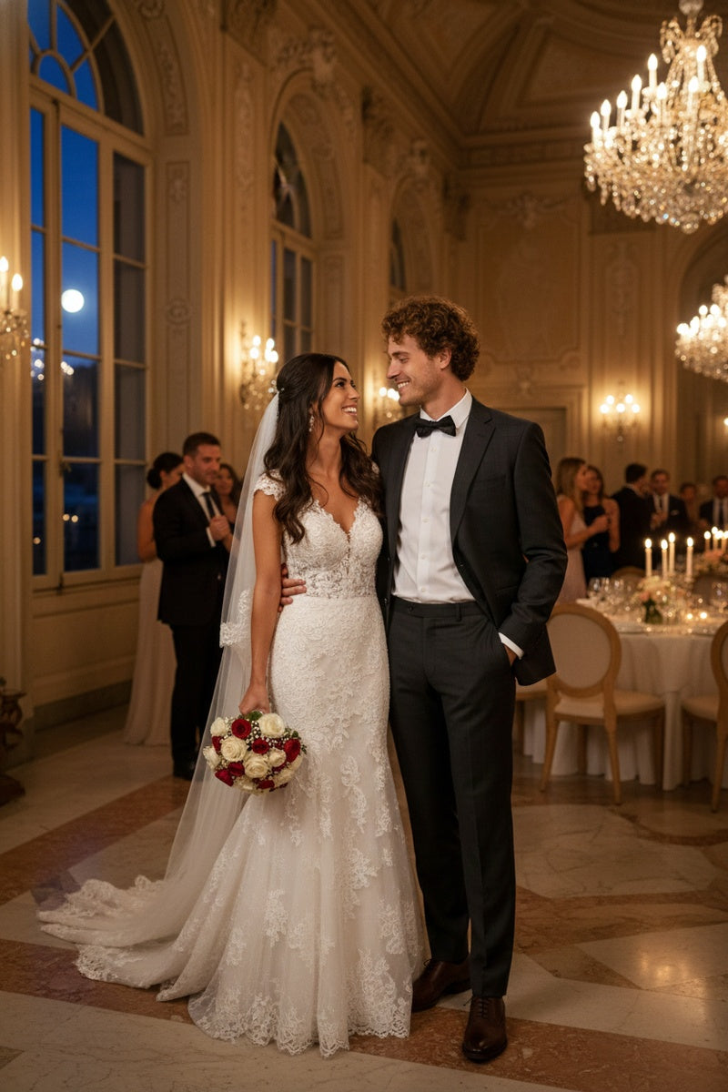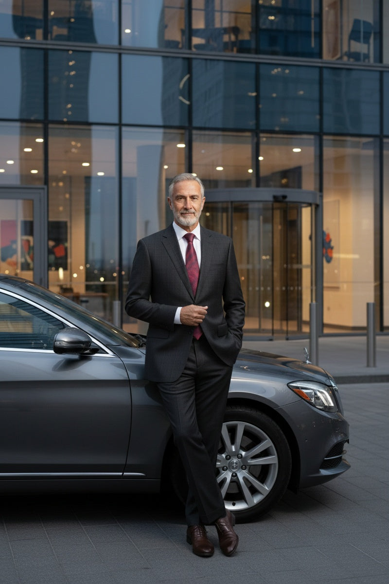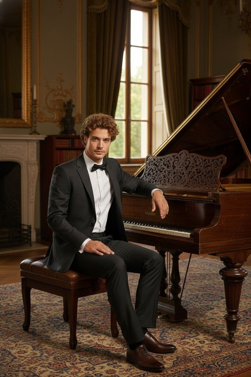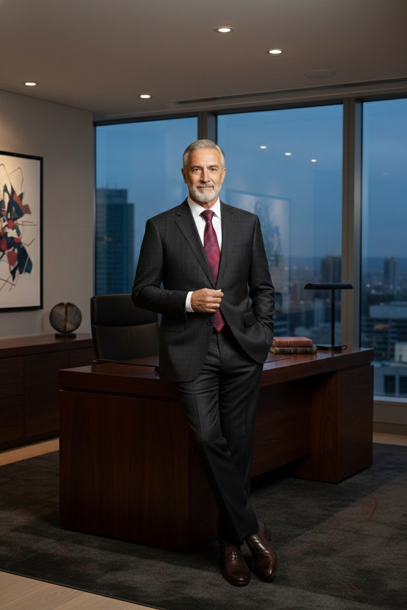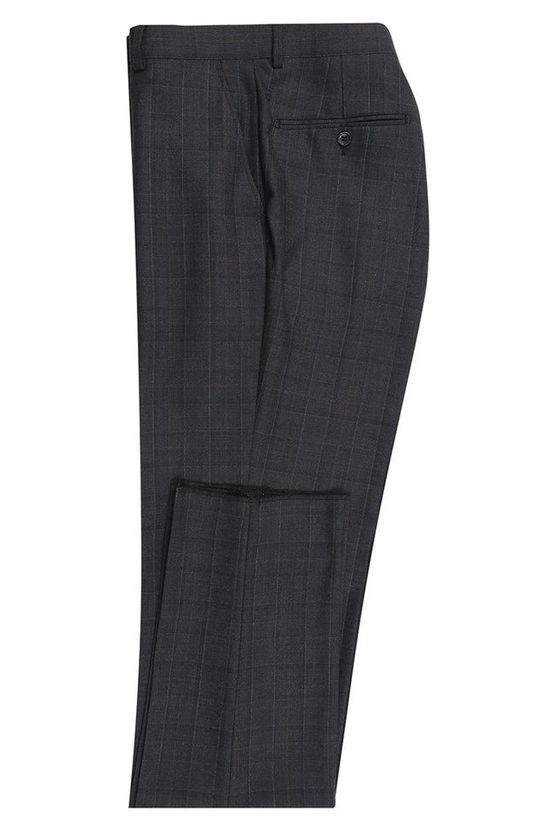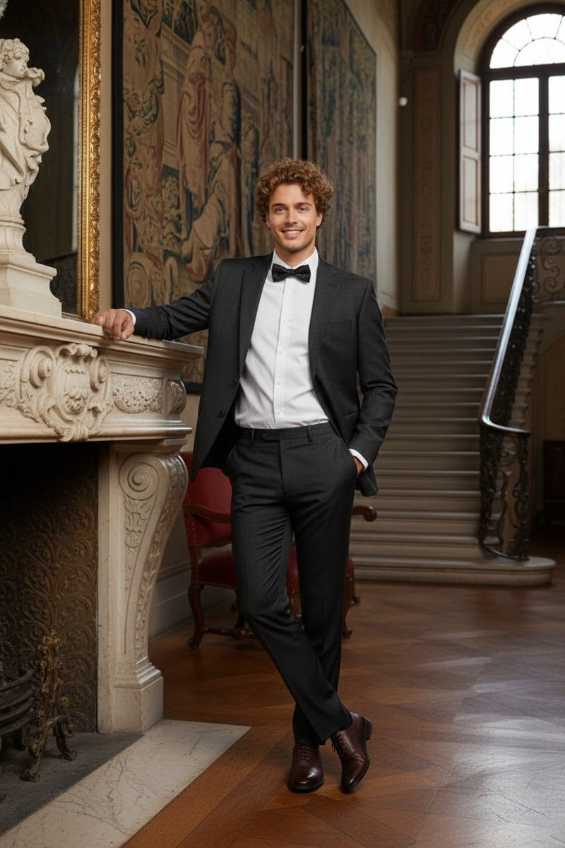 The Black Windowpane 2-Button Notch Suit, designed by Alessandro Vitello, is hand-tailored in a signature classic fit and crafted using a wool blend fabric. The front of the jacket features notch lapels. The front enclosure features two buttons and dual lower front besom pockets. A top welt pocket is located on the left side of the jacket to properly store a pocket square. Darts stitched down the front of the jacket are tailored to perfection giving a desired tapered shape to the garment. Towards the cuff of each jacket sleeve, there are vented sleeves once again showing that no details were overlooked in design. Lastly, let's not forget the interior of the jacket. Silky soft interior lining complemented with plenty of pocket storage provides an ultra comfortable formal wear experience.