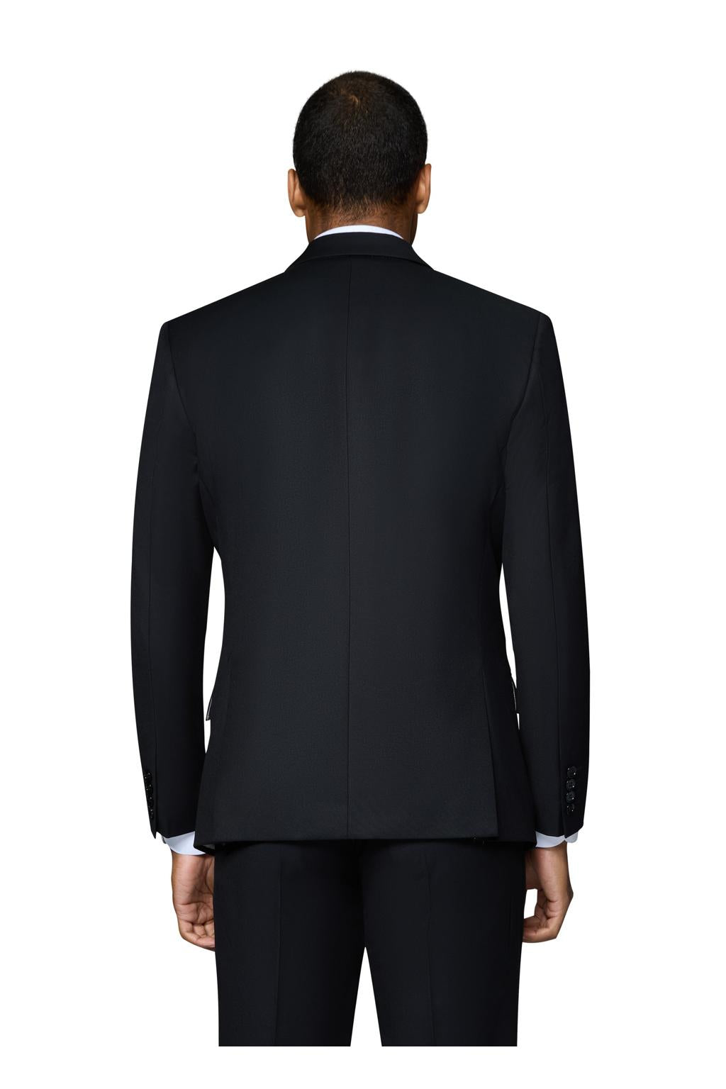 The "Ashford" Black Men's Suit, designed by Bergamo Elegant, is hand-tailored in a signature modern fit or slim fit and crafted using a Super 150's luxury viscose blend fabric. The relatively high thread count of this 100% viscose blend fabric ensures a soft, luxurious feel that one would expect from Berragamo. The front of the jacket features notch lapels with a two button front enclosure. A top welt pocket is located on the left side of the jacket to properly store a pocket square. Darts stitched down the front of the jacket are tailored to perfection giving a desired tapered shape to the garment. Towards the cuff of each jacket sleeve, there are vented sleeves with satin-faced buttons once again showing that no details were overlooked in design. As we rotate towards the back of the jacket, we notice dual side vents providing a modern, updated look. Lastly, let's not forget the interior of the jacket. Silky soft interior lining complemented with plenty of pocket storage provides an ultra comfortable formal wear experience.