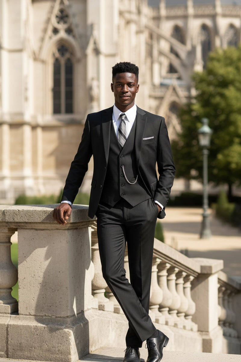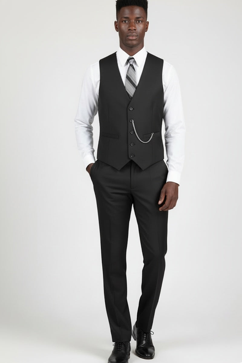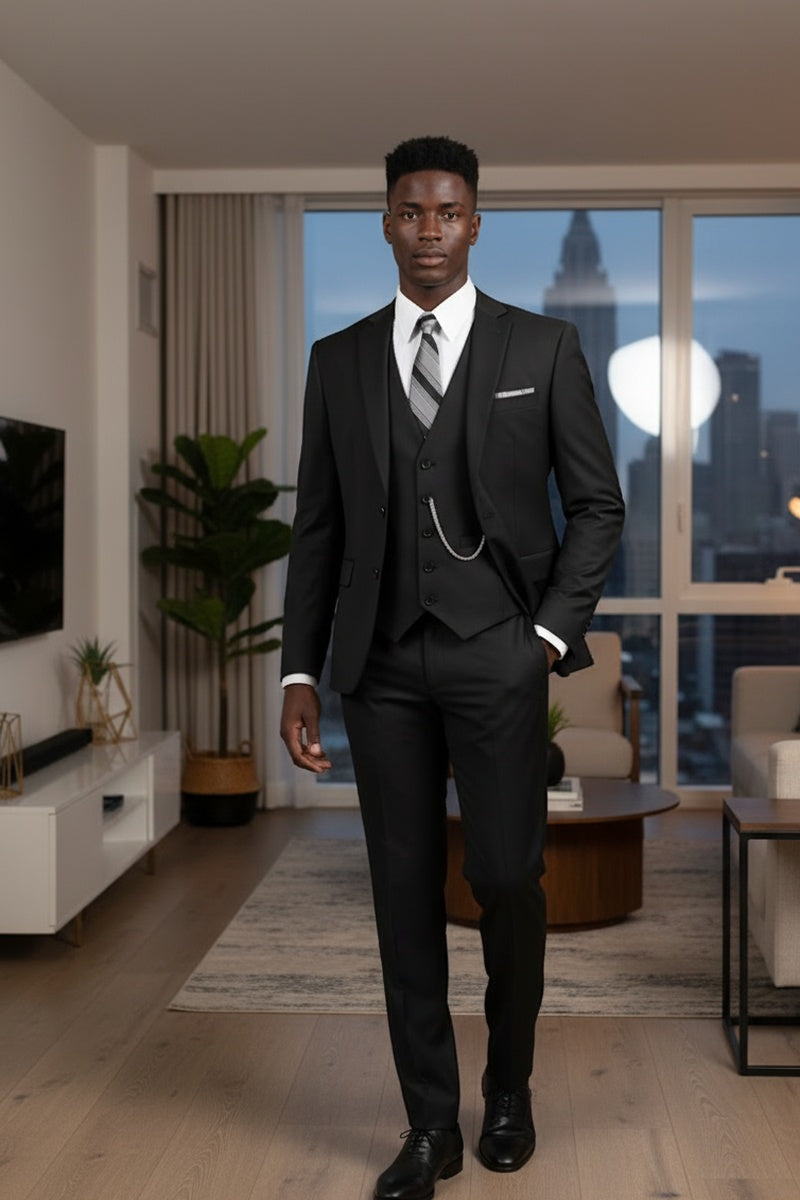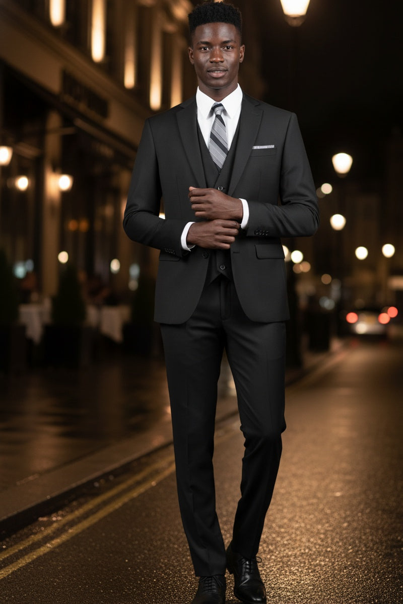 The "Preston" Black Suit, designed by Vinci, is hand-tailored in a signature slim fit and crafted using a Super 150's luxury viscose blend fabric. The relatively high thread count of this viscose blend fabric ensures a soft, luxurious feel that one would expect from Vinci. The front of the jacket features notch lapels with a 2-button front enclosure. A top welt pocket is located on the left side of the jacket to properly store a pocket square. Darts stitched down the front of the jacket are tailored to perfection giving a desired tapered shape to the garment. Towards the cuff of each jacket sleeve, there are vented sleeves with satin-faced buttons once again showing that no details were overlooked in design. As we rotate towards the back of the jacket, we notice dual side vents providing a modern, updated look. Lastly, let's not forget the interior of the jacket. Silky soft interior lining complemented with plenty of pocket storage provides an ultra comfortable formal wear experience.