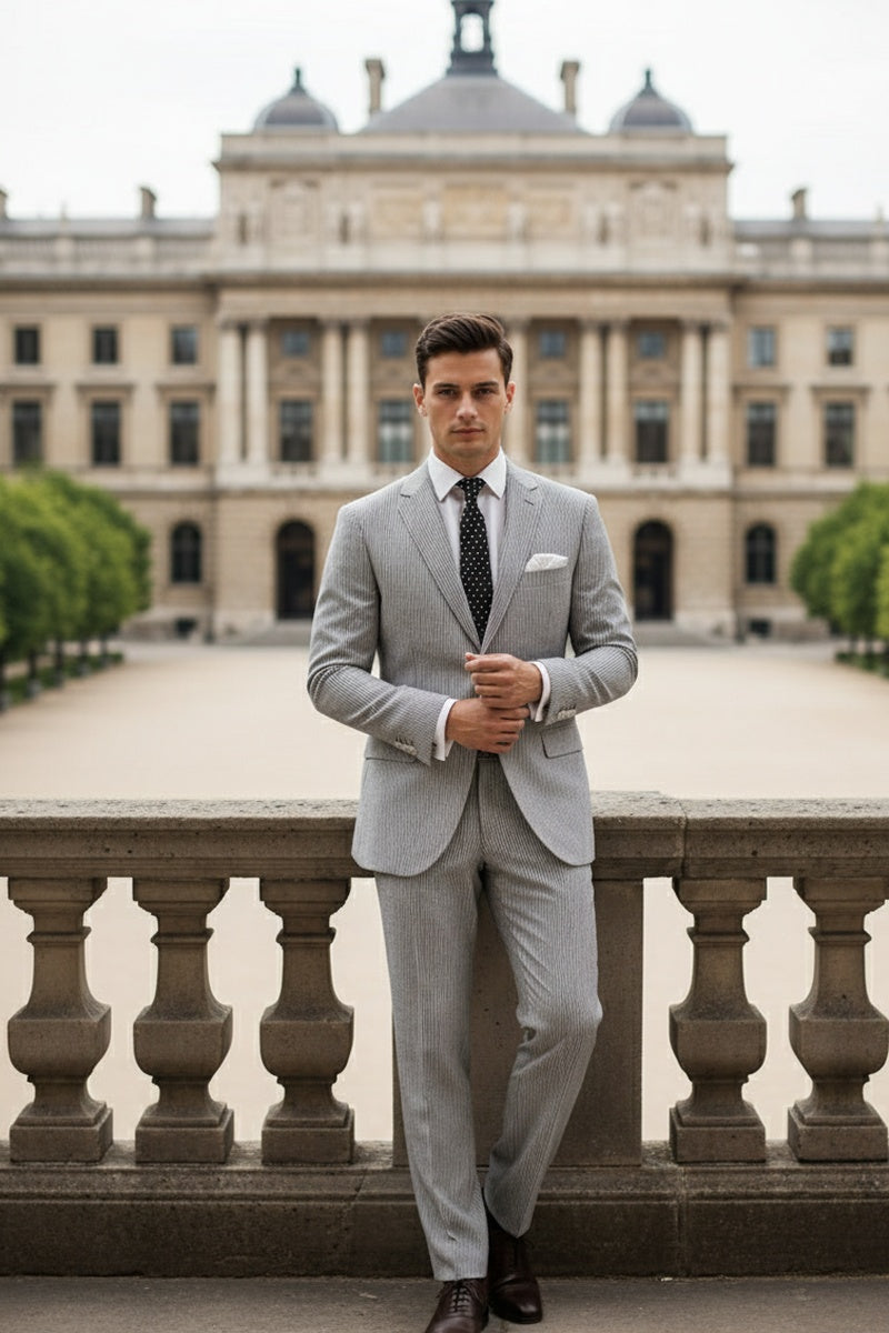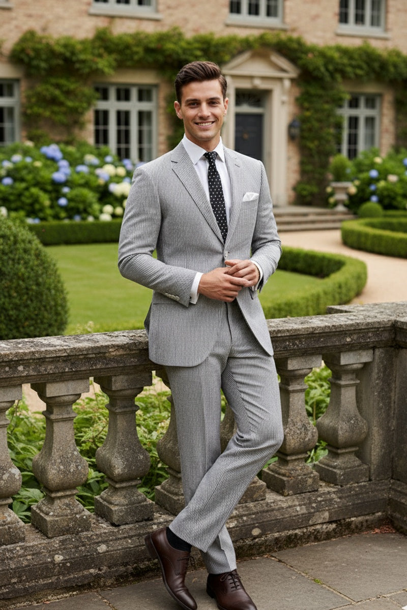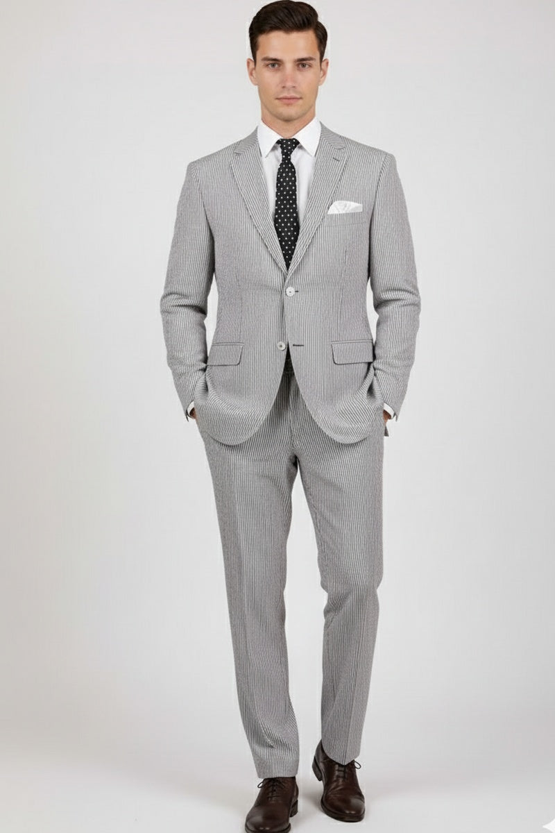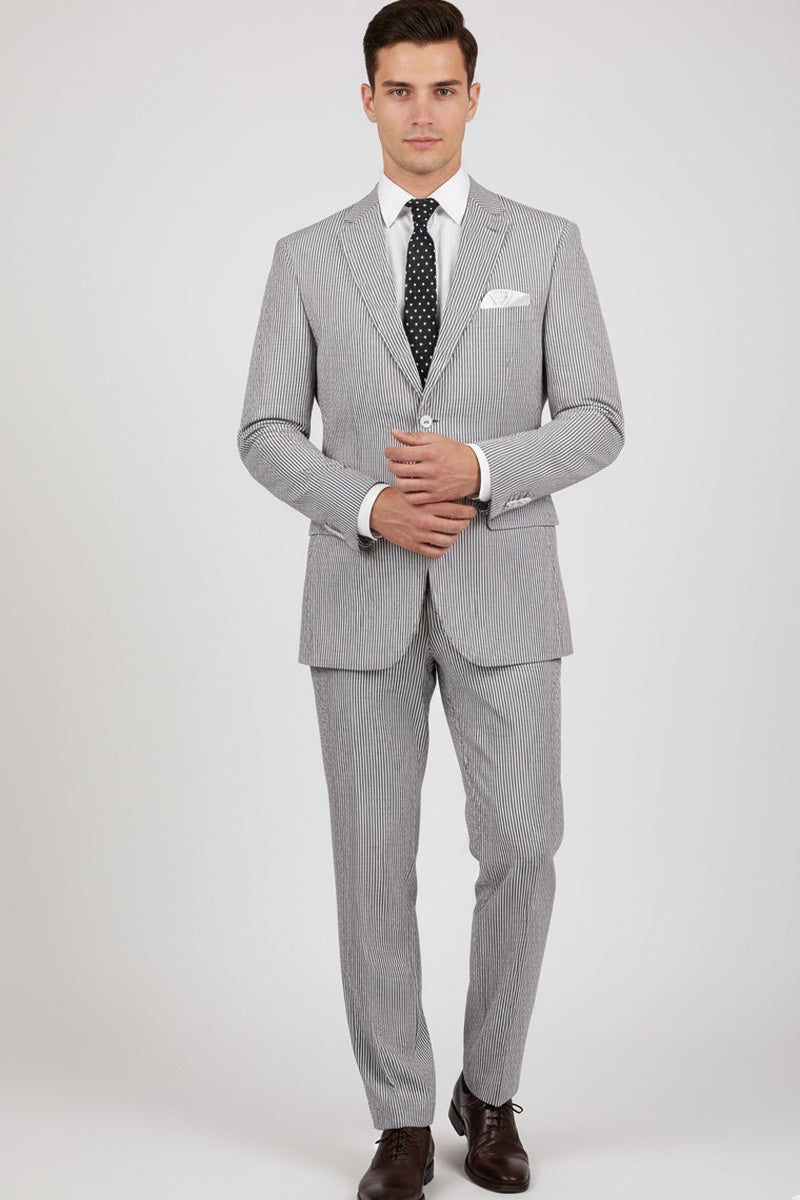 The "Seersucker" Black Suit, designed by Vinci, is hand-tailored in a modern fit and crafted using a seersucker fabric. The front of the jacket features notch lapels with a 2-button front enclosure. A top welt pocket is located on the left side of the jacket to properly store a pocket square. Darts stitched down the front of the jacket are tailored to perfection giving a desired tapered shape to the garment. Towards the cuff of each jacket sleeve, there are vented sleeves once again showing that no details were overlooked in design. As we rotate towards the back of the jacket, we notice dual side vents providing a modern, updated look. Lastly, let's not forget the interior of the jacket. Silky soft interior lining complemented with plenty of pocket storage provides an ultra comfortable formal wear experience.