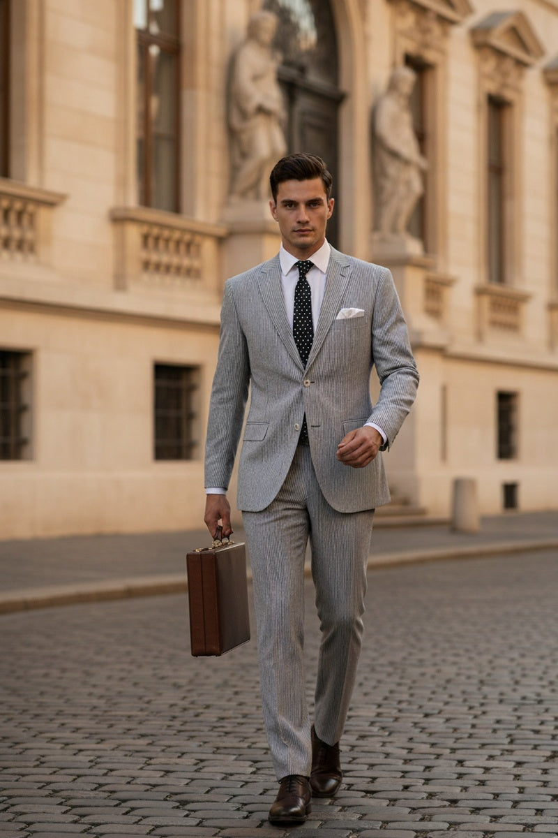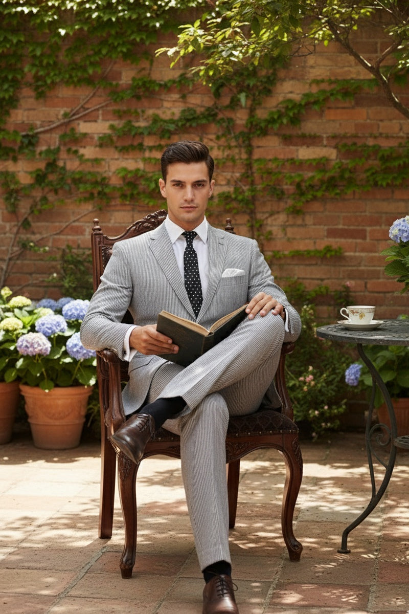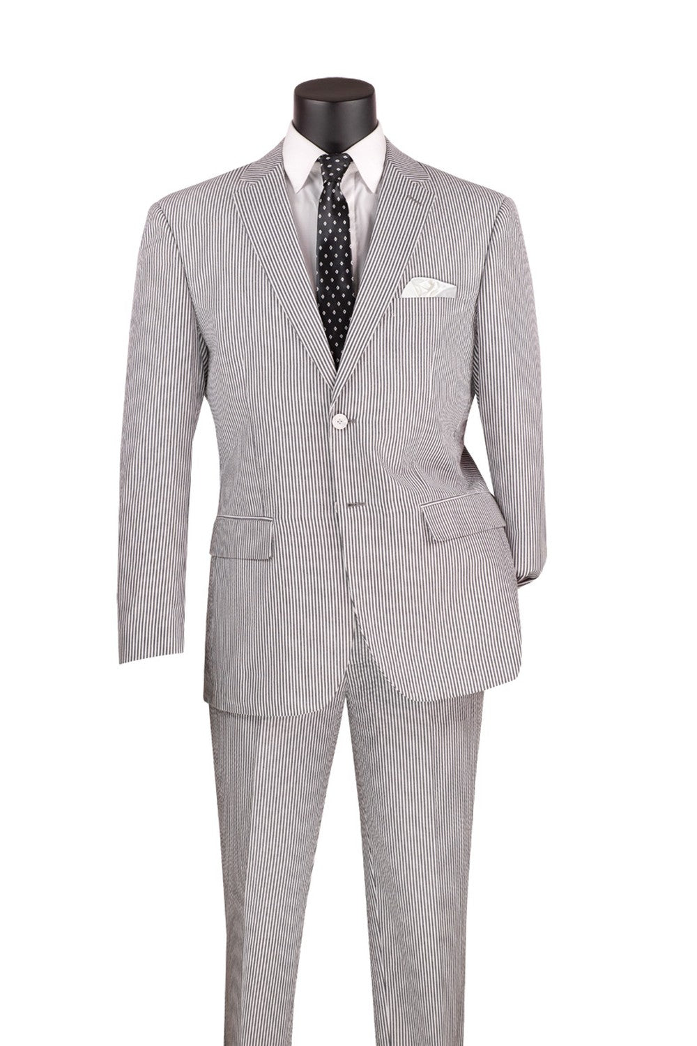 The "Seersucker" Black Suit, designed by Vinci, is hand-tailored in a modern fit and crafted using a seersucker fabric. The front of the jacket features notch lapels with a 2-button front enclosure. A top welt pocket is located on the left side of the jacket to properly store a pocket square. Darts stitched down the front of the jacket are tailored to perfection giving a desired tapered shape to the garment. Towards the cuff of each jacket sleeve, there are vented sleeves once again showing that no details were overlooked in design. As we rotate towards the back of the jacket, we notice dual side vents providing a modern, updated look. Lastly, let's not forget the interior of the jacket. Silky soft interior lining complemented with plenty of pocket storage provides an ultra comfortable formal wear experience.