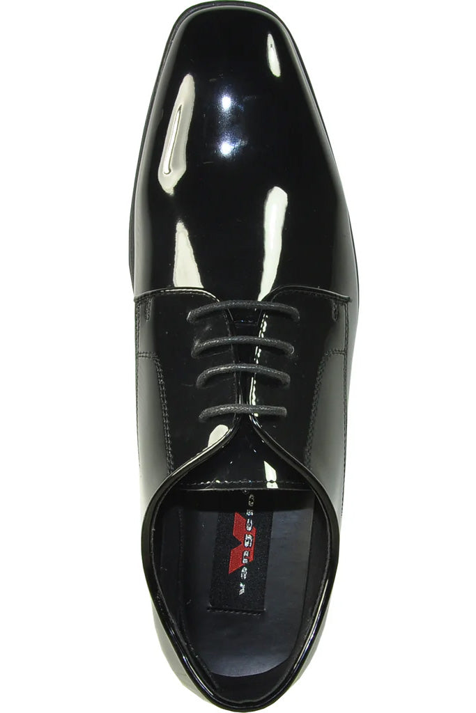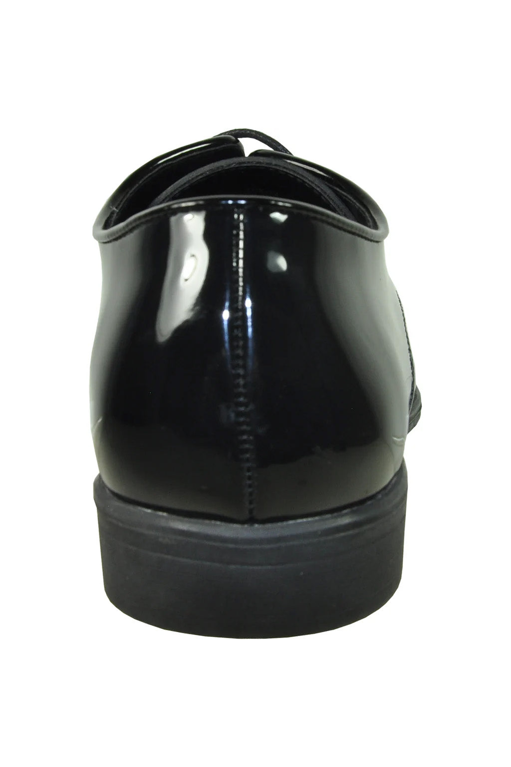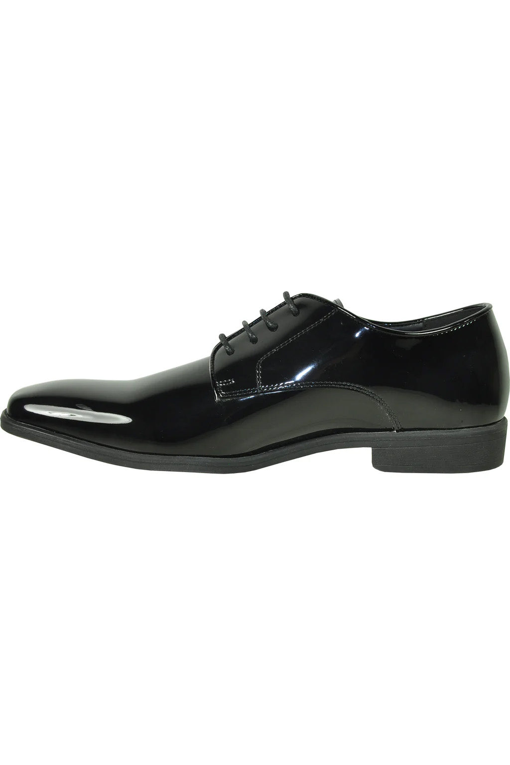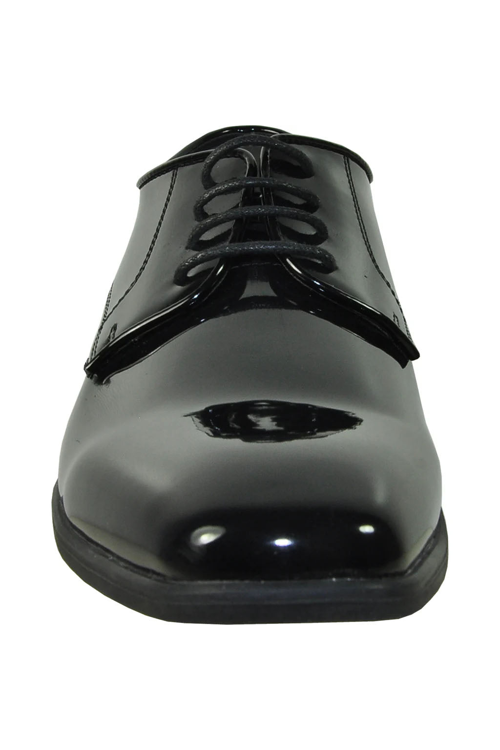 The Nolan is a contemporary black patent dress oxford tuxedo shoe designed by Vangelo. This classic lace up style is crafted from a never-creasing and easy to clean scruff material. Premium fully lined interior and an odor free stitched-in sole provide comfort during long-time wear. This classic tuxedo shoe pairs well with your favorite tuxedo for a traditional and polished look.