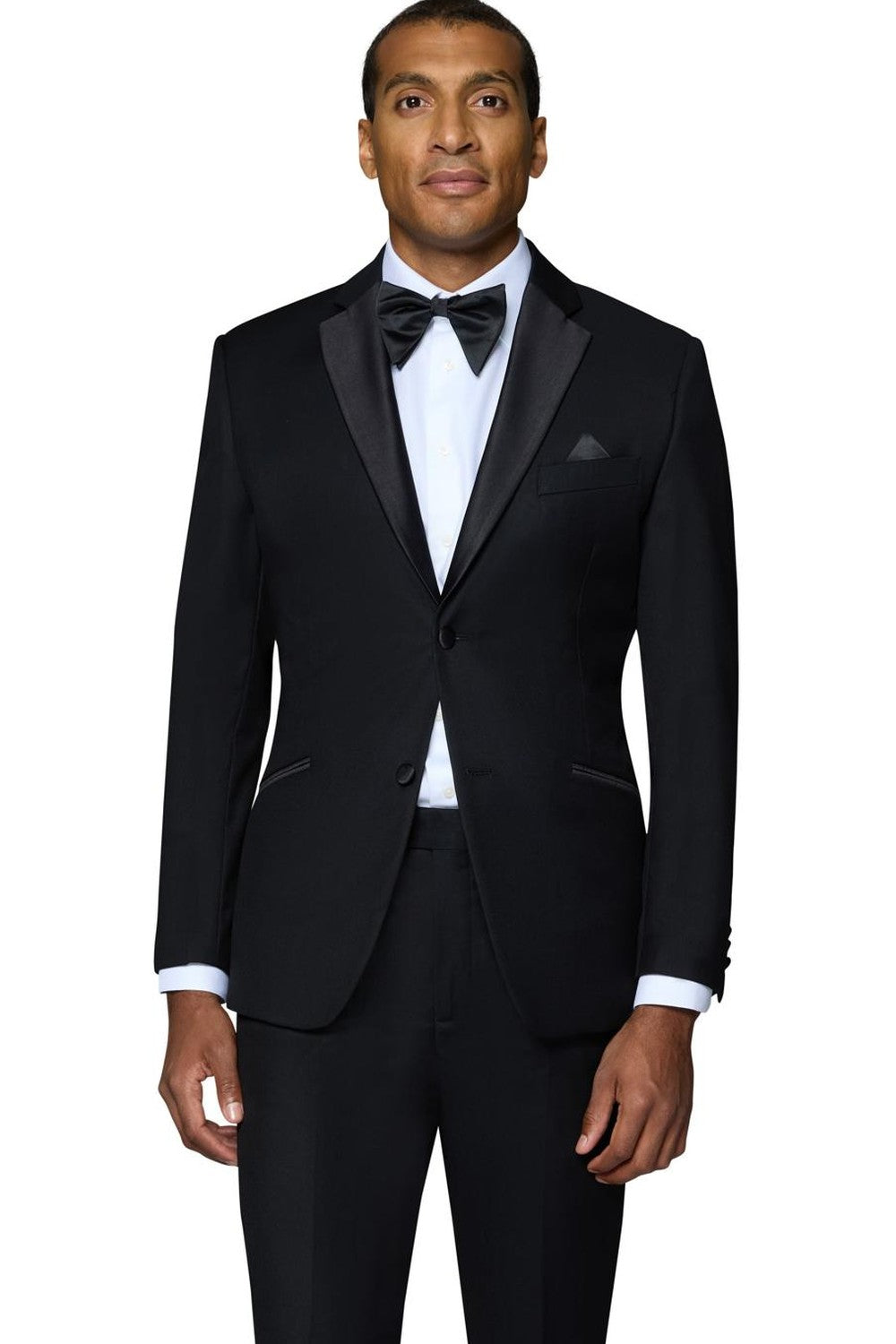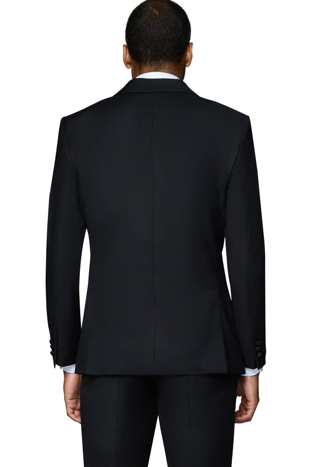 The "Pembroke" Black Tuxedo, designed by Bergamo Elegant, is hand-tailored in a signature modern fit or slim fit and crafted using a Super 150's luxury viscose blend fabric. The relatively high thread count of this 100% viscose blend fabric ensures a soft, luxurious feel that one would expect from Berragamo. The front of the jacket features notch lapels which are detailed in a black premium satin. The front enclosure features one button wrapped in coordinating black satin fabric while the dual lower front besom pockets, highlighted in the same black satin fabric, unify the look. A top welt pocket is located on the left side of the jacket to properly store a pocket square. Darts stitched down the front of the jacket are tailored to perfection giving a desired tapered shape to the garment. Towards the cuff of each jacket sleeve, there are vented sleeves with satin-faced buttons once again showing that no details were overlooked in design. As we rotate towards the back of the jacket, we notice dual side vents providing a modern, updated look. Lastly, let's not forget the interior of the jacket. Silky soft interior lining complemented with plenty of pocket storage provides an ultra comfortable formal wear experience.