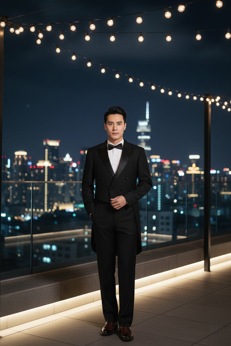 The Gabriel Black Tuxedo, designed by Renoir, is hand-tailored in a signature classic fit and crafted using luxury viscose blend fabric. The relatively high thread count of this viscose blend fabric ensures a soft, luxurious feel that one would expect from Ferrecci. The front of the jacket features peak lapels which are detailed in a black premium satin. The front enclosure features 6 buttons wrapped in coordinating satin fabric while the dual lower front besom pockets, highlighted in the same black satin fabric, unify the look. A top welt pocket is located on the left side of the jacket to properly store a pocket square.