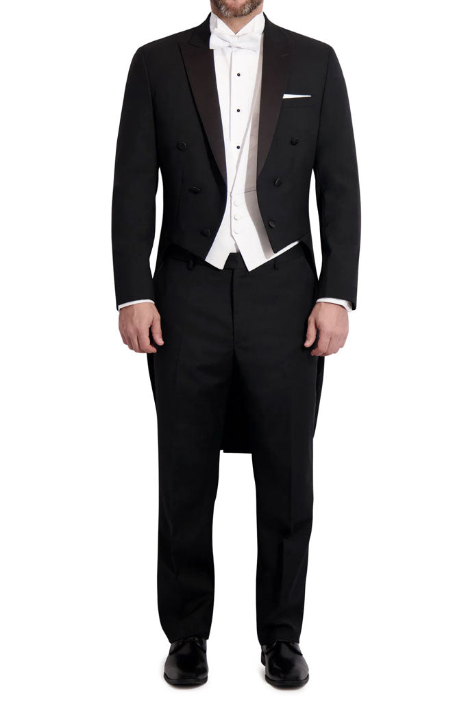 COMPANION PANTS: The pants that were designed to go with this "Edward" Black Tailcoat Jacket is the "Washington" Black Tuxedo Pants, featuring an updated 1/8" narrow satin stripe going down the outer side of each leg.