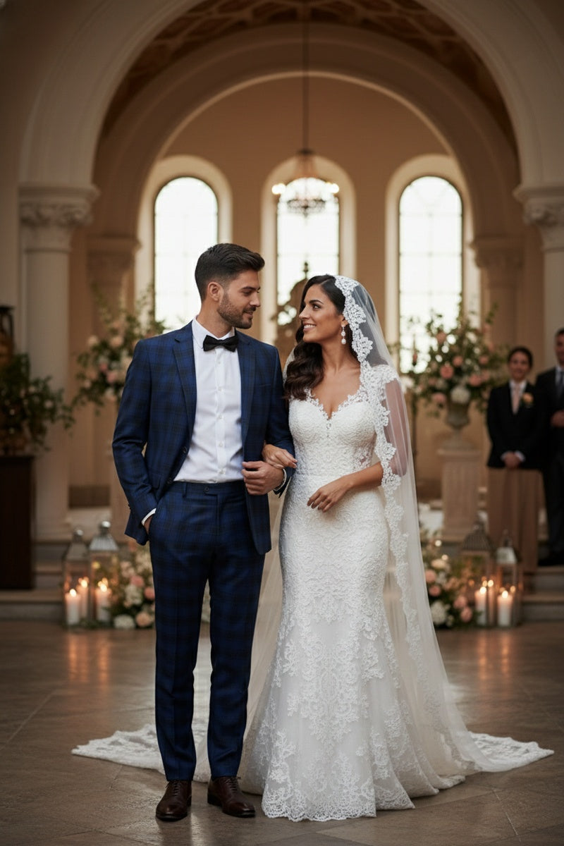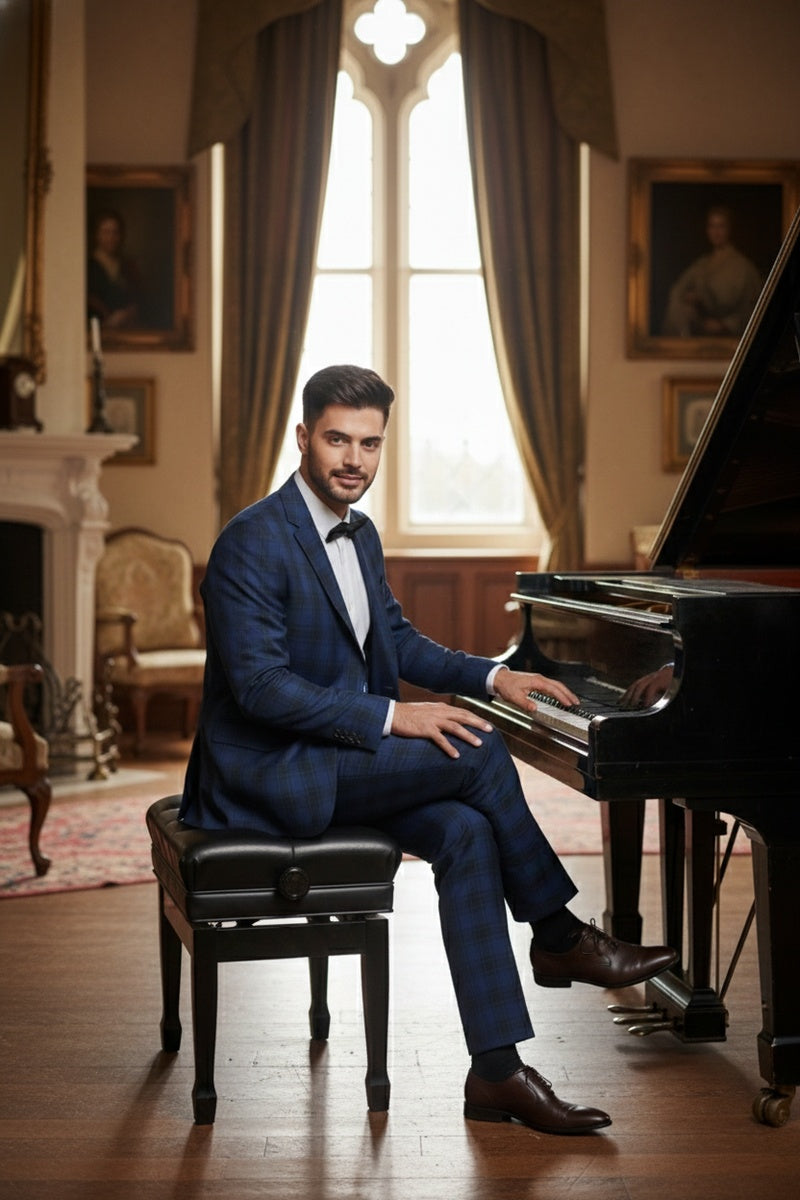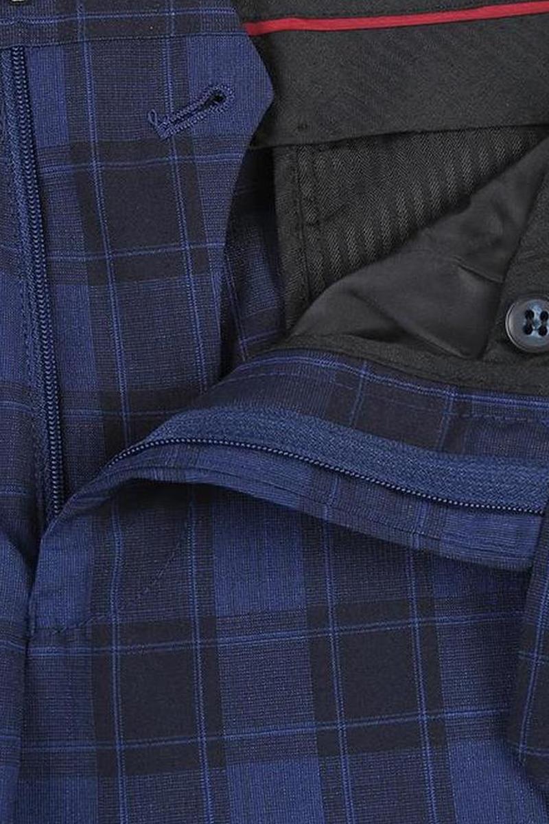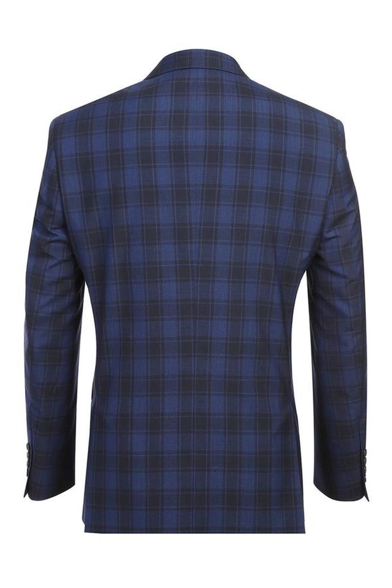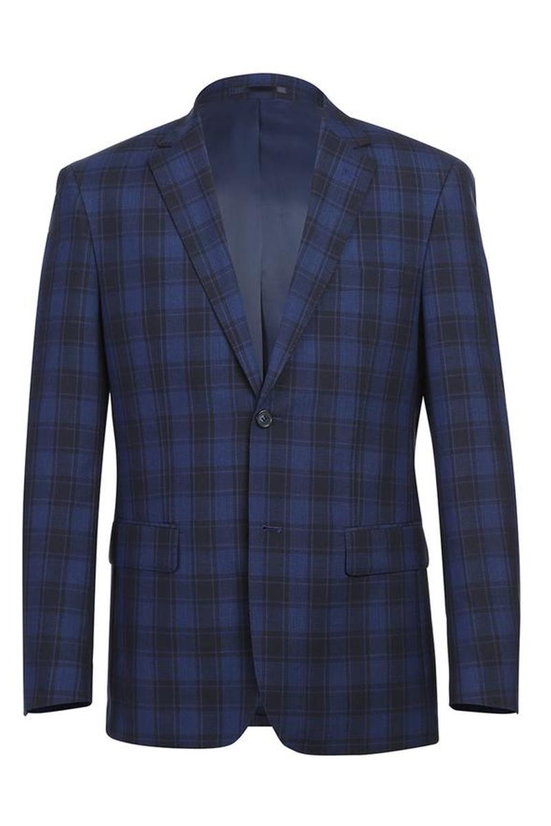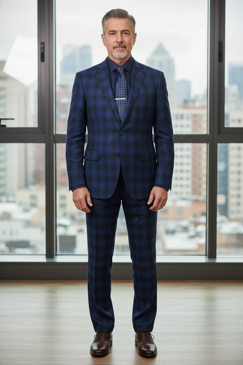 The Navy Windowpane 2-Button Notch Suit, designed by Alessandro Vitello, is hand-tailored in a signature classic fit and crafted using a premiumpoly-rayon stretch fabric. The front of the jacket features notch lapels. The front enclosure features two buttons and dual lower front besom pockets. A top welt pocket is located on the left side of the jacket to properly store a pocket square. Darts stitched down the front of the jacket are tailored to perfection giving a desired tapered shape to the garment. Towards the cuff of each jacket sleeve, there are vented sleeves once again showing that no details were overlooked in design. Lastly, let's not forget the interior of the jacket. Silky soft interior lining complemented with plenty of pocket storage provides an ultra comfortable formal wear experience.