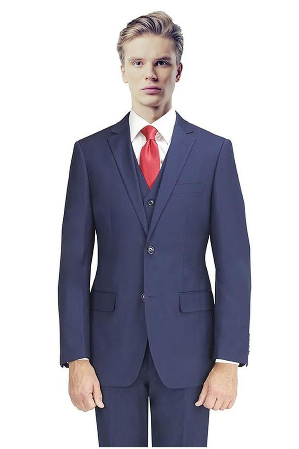 Color: Navy Material: 100% Wool Thread Count/Feel: Super 140's Pattern: Solid Jacket Lapels: Notch Front Buttons: 2 Jacket Vents: Side Vents Pant Style: Plain Front Fit & Sizes: Modern Fit (36 - 64); Slim Fit (36 - 48) Designer: Mantoni Sizing Program: Nested (6" Drop)
