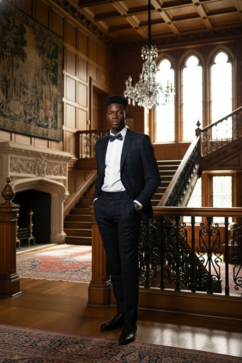The Blue 2-Button Notch Suit, designed by Renoir, is hand-tailored in a signature classic fit and crafted using a premiumpoly-rayon stretch fabric. The front of the jacket features notch lapels. The front enclosure features two buttons and dual lower front besom pockets. A top welt pocket is located on the left side of the jacket to properly store a pocket square. Darts stitched down the front of the jacket are tailored to perfection giving a desired tapered shape to the garment. Towards the cuff of each jacket sleeve, there are vented sleeves once again showing that no details were overlooked in design. Lastly, let's not forget the interior of the jacket. Silky soft interior lining complemented with plenty of pocket storage provides an ultra comfortable formal wear experience.