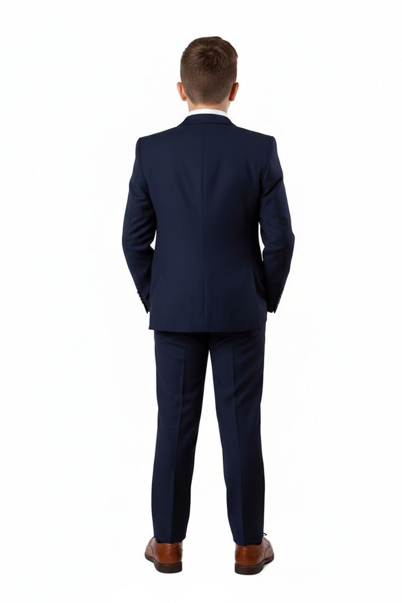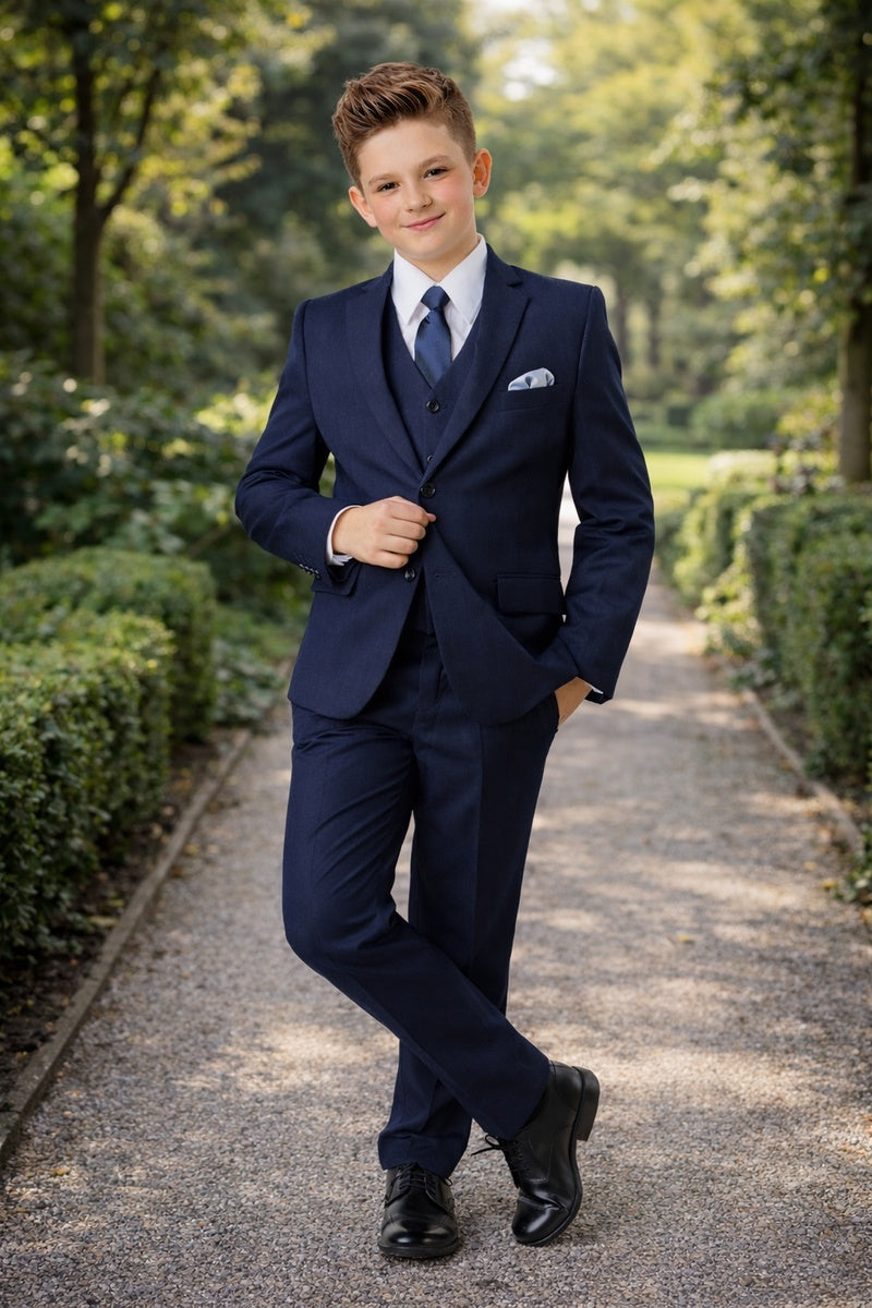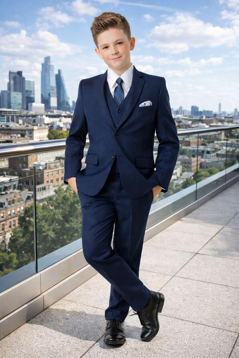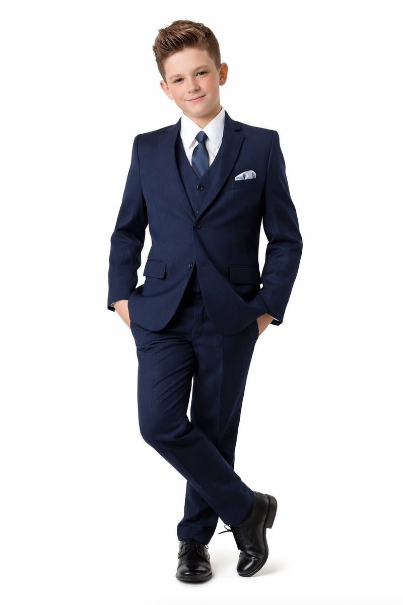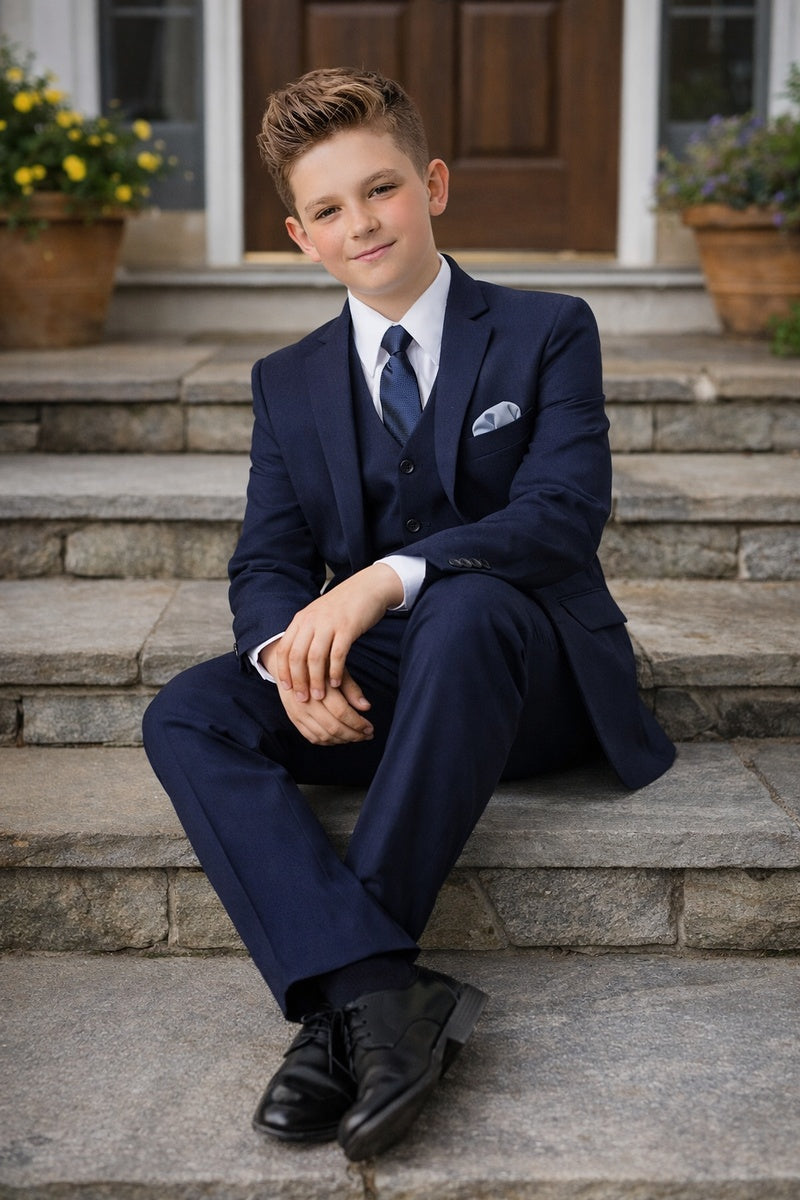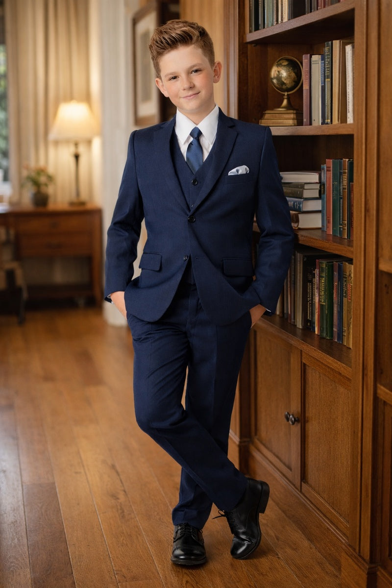 This 5-piece set includes the jacket, pants, shirt, vest, and tie.