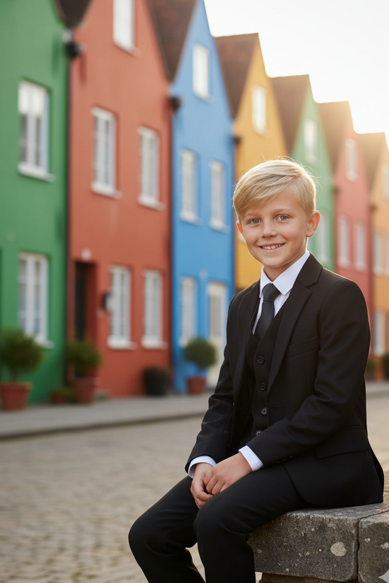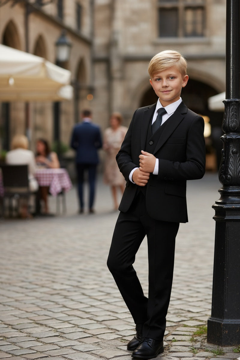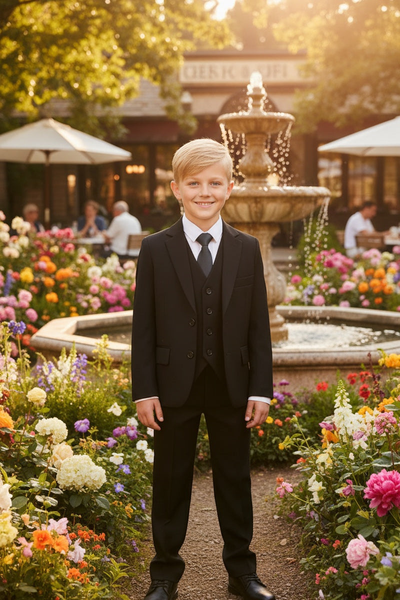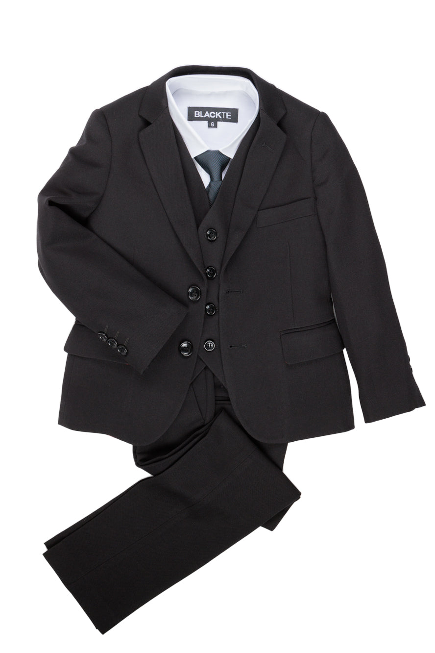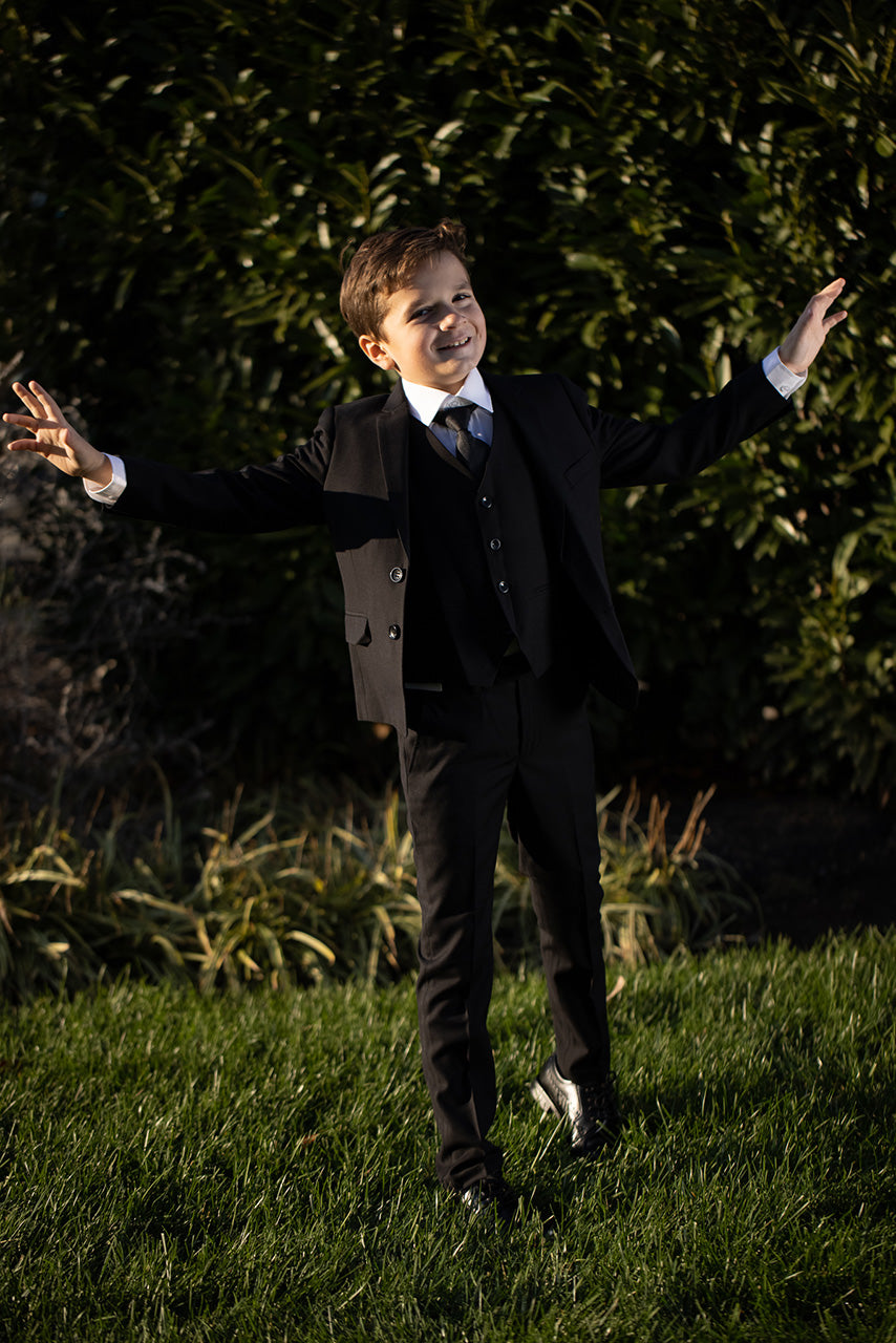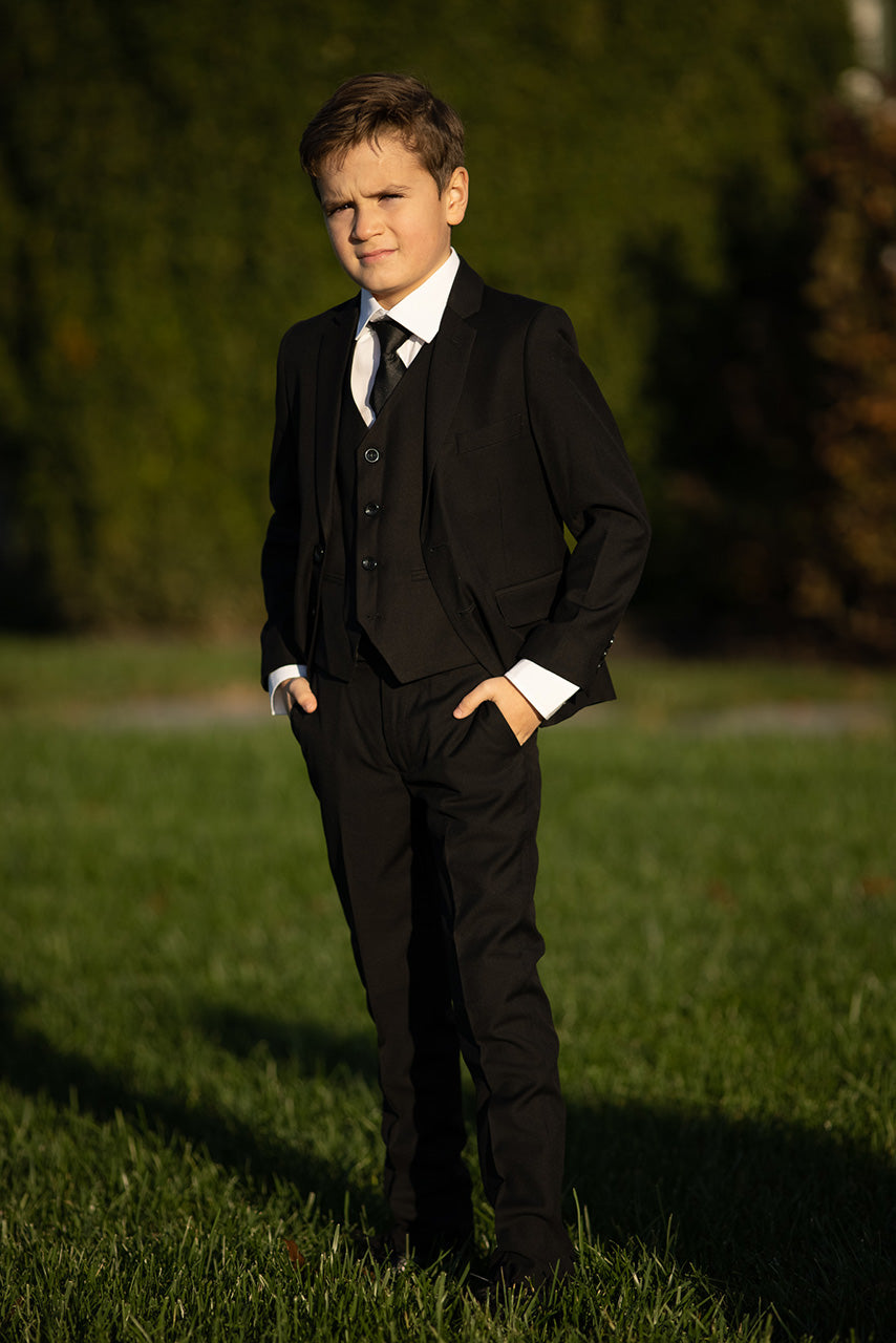 The "Liam" 5-Piece Suit Set, designed by BLACKTIE, is part of our Stretch Collection (our most luxurious collection). Premium jacket, pants, and vest fabric consists of four-way stretch so your little one can still run & play in comfort. Stretch interior lining, a stretch shirt, expandable pants, and adjustable vest & necktie were designed to provide the most comfort possible. The overall craftsmanship of the Stretch Collection is equal to what you find in premium adult version suits. When only the best will do for your precious son or daughter, the Stretch Collection is the way to go!