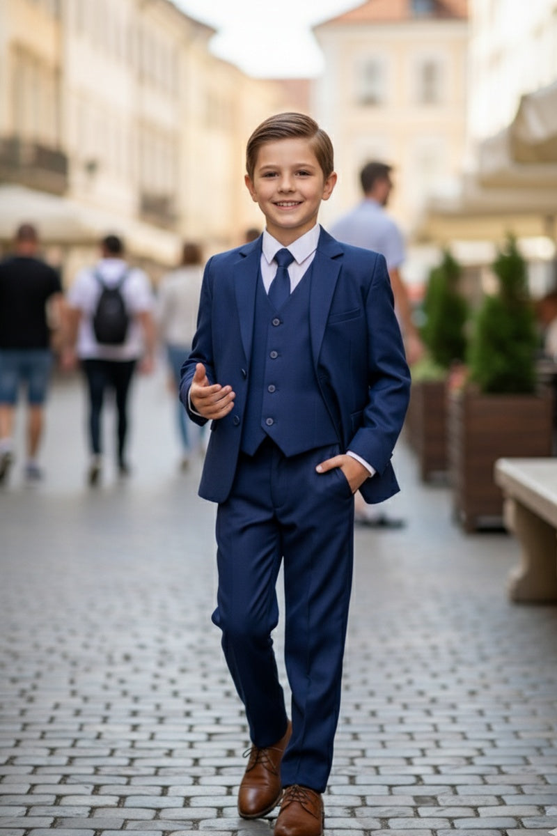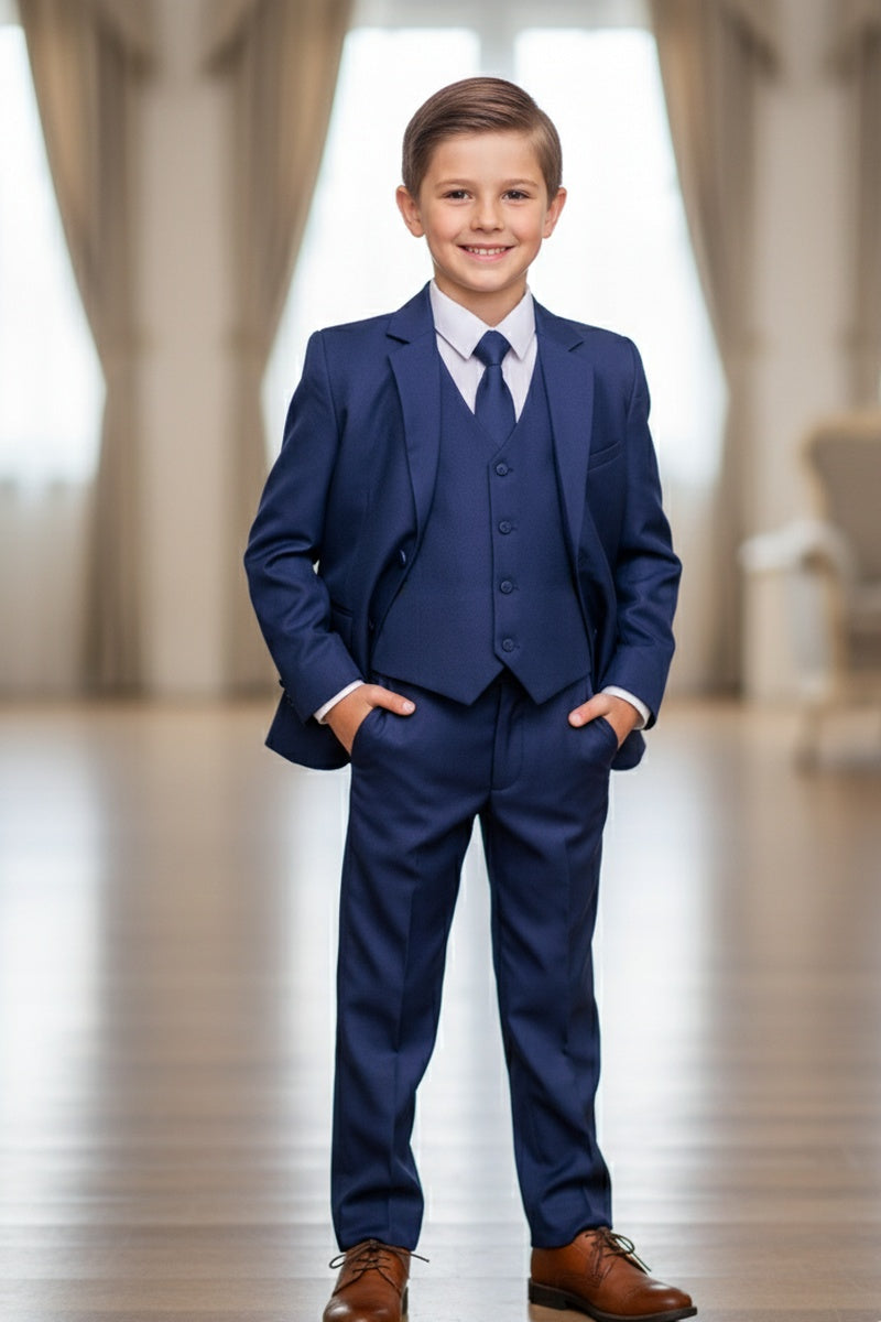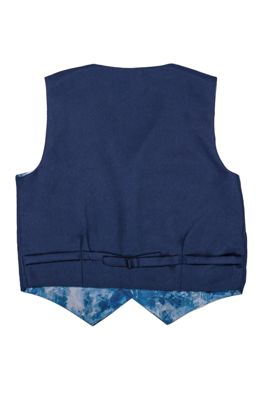 The "Mason" 5-Piece Suit Set, designed by Little Tuxedos, is part of our Essentials Collection. At an attractive price point, the Essentials Collection is one of our best sellers! Available in both classic fit and husky fit, the Essentials will accommodate kids of different shapes & sizes. Kids also love to show off the interior blue abstract premium lining! An expandable waist feature, adjustable vest, and adjustable necktie provide additional comfort for your little one.