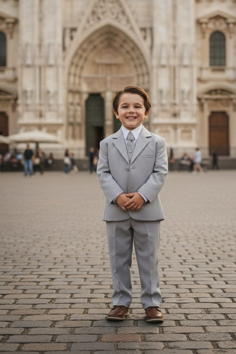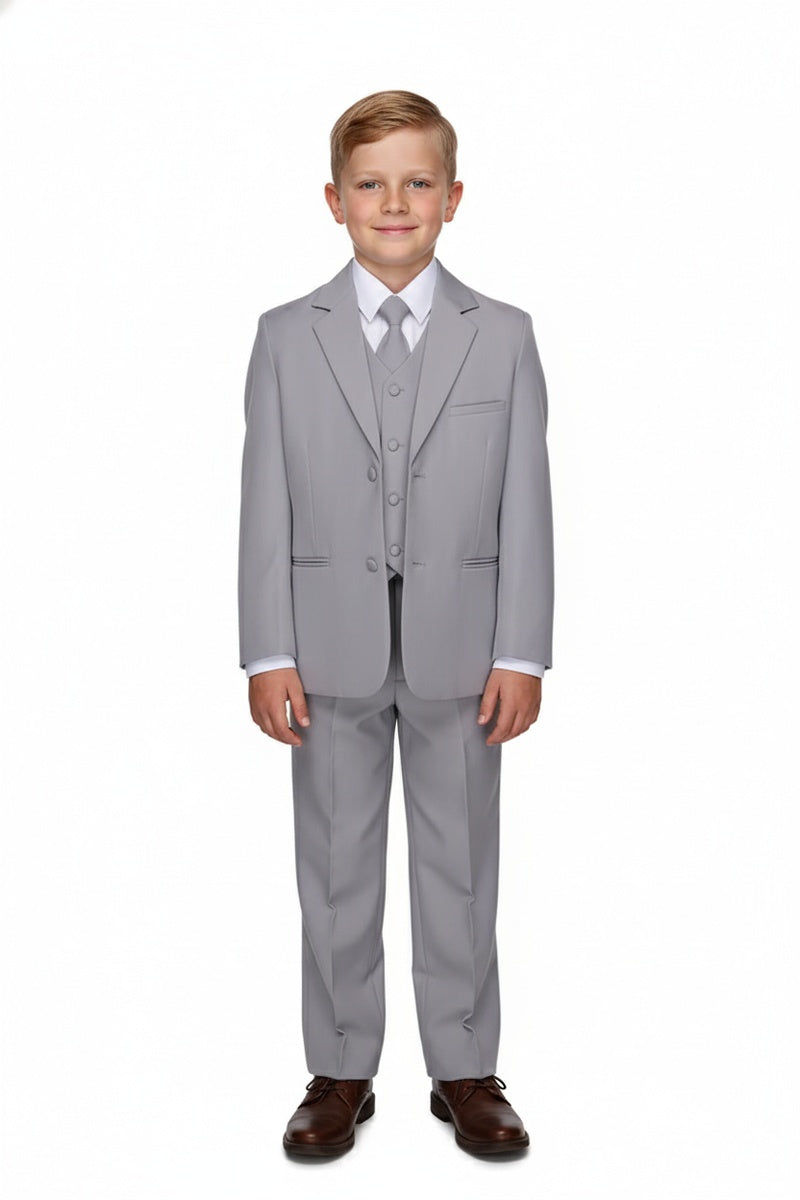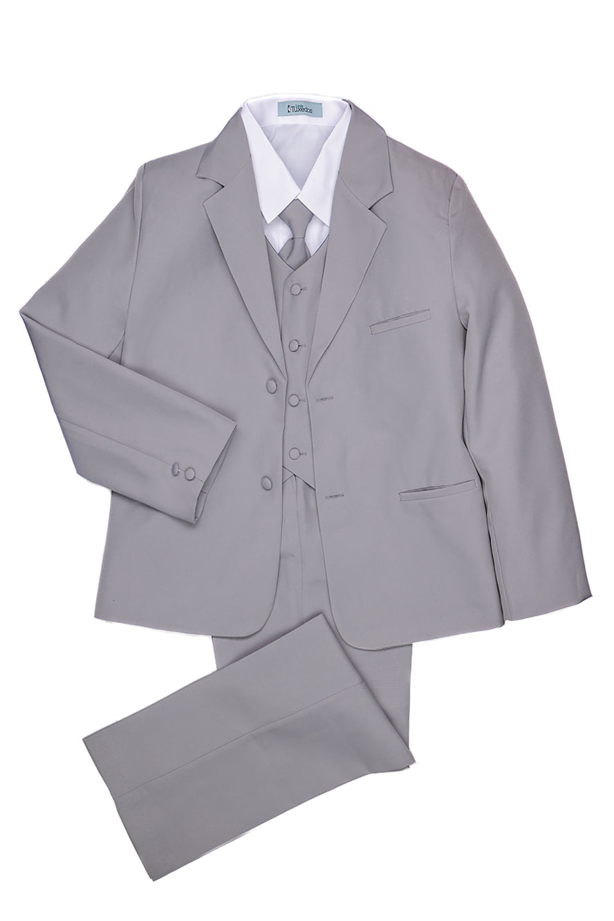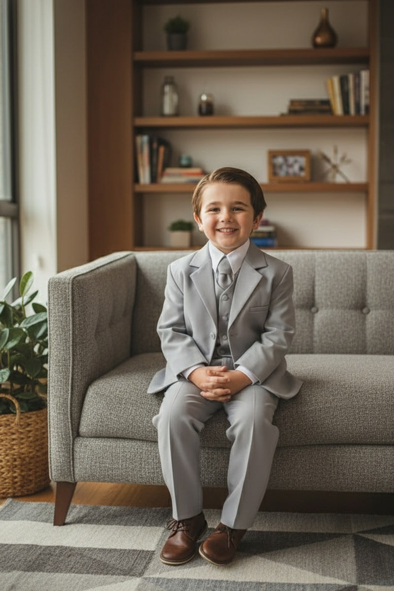 Featured on TheKnot.com The "Mason" Light Grey 5-Piece Kids Set is featured in TheKnot.com's exclusive fashion gallery.