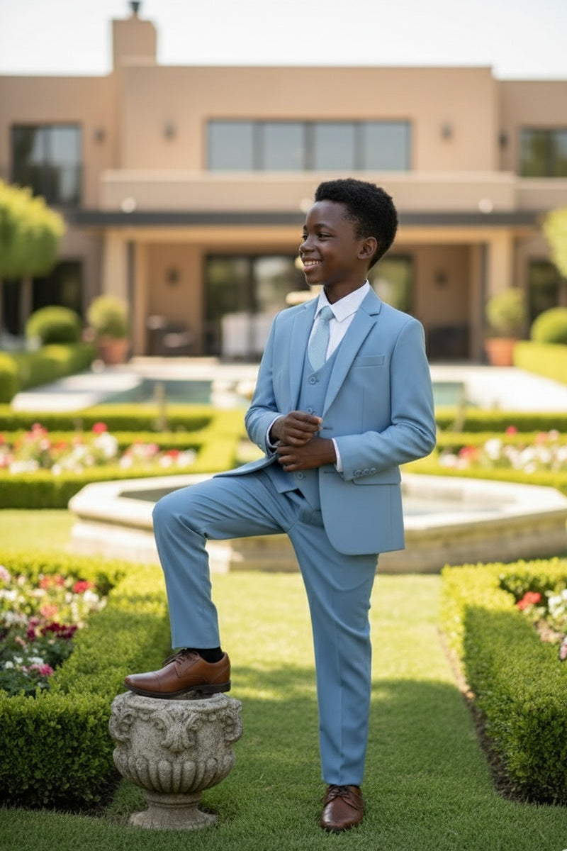 The "Noah" 5-Piece Suit Set, designed by Perry Ellis, is part of our Signature Collection. The 2% stretch is woven into the jacket, pants, and vest fabric to provide additional comfort. Other upgraded features include 3-button vented sleeves on the jacket, french-faced interior lining, and a premium textured cotton blend shirt to elevate the overall look. The expandable waist feature and adjustable vest & necktie were designed to make it easier to fit your little one.