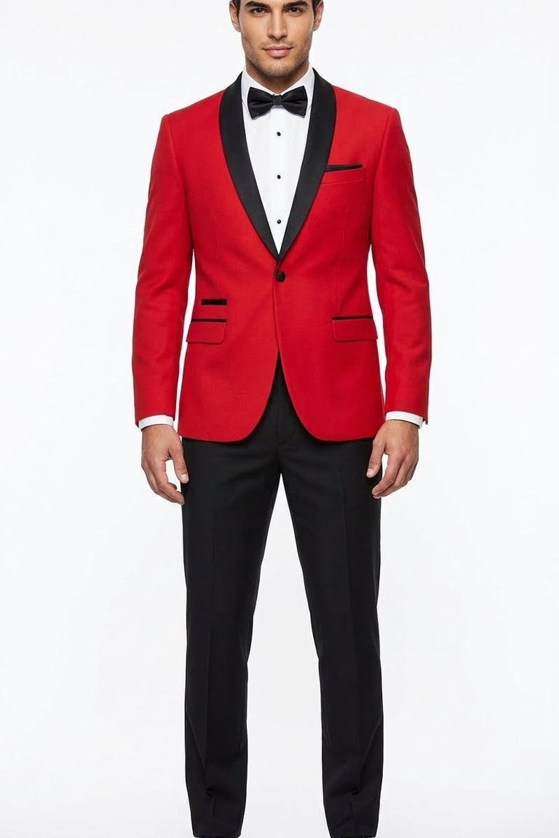 The Vegas Red Tuxedo, designed by West End, is hand-tailored in a signature modern fit and crafted using a Super 150's viscose blend fabric. The relatively high thread count of this viscose blend fabric ensures a soft, luxurious feel that one would expect from West End. The front of the jacket features shawl lapels which are detailed in a black premium satin. The front enclosure features 1 button wrapped in coordinating satin fabric while the dual lower front besom pockets, highlighted in the same black satin fabric, unify the look. A top welt pocket is located on the left side of the jacket to properly store a pocket square. Darts stitched down the front of the jacket are tailored to perfection giving a desired tapered shape to the garment. Towards the cuff of each jacket sleeve, there are vented sleeves with satin-faced buttons once again showing that no details were overlooked in design. Lastly, let's not forget the interior of the jacket. Silky soft interior lining complemented with plenty of pocket storage provides an ultra comfortable formal wear experience.
