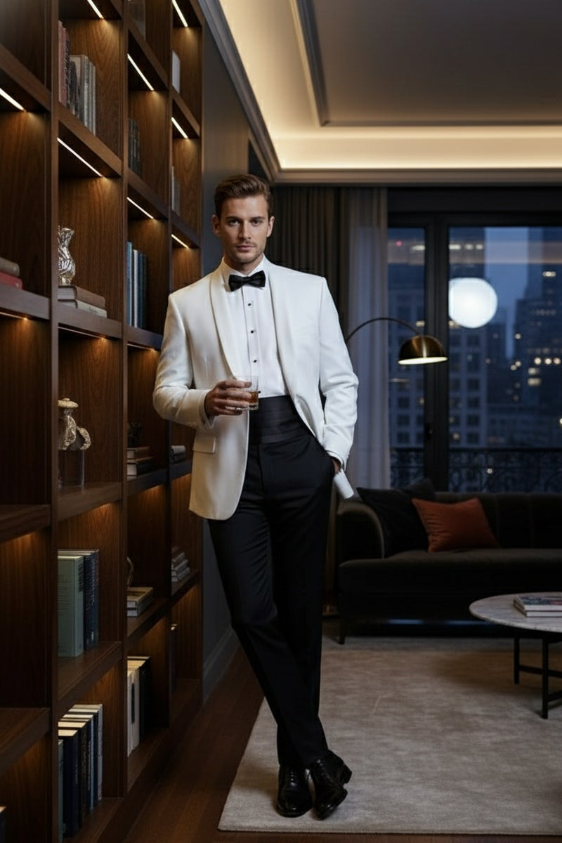 COMPANION PANTS: The pants that were designed to go with this "Brentwood" jacket is the "Washington" Black Tuxedo Pants, featuring an updated 1/8" narrow satin stripe going down the outer side of each leg.