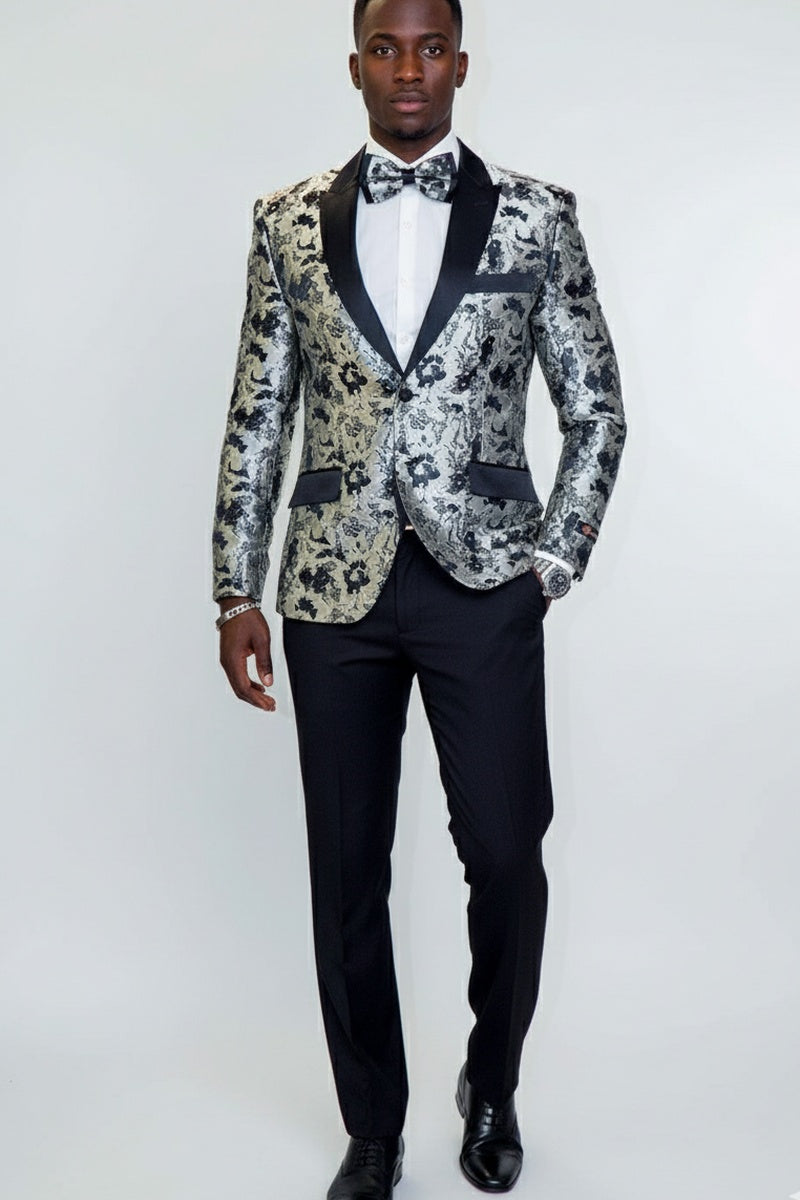 "Amsterdam" Silver Tuxedo Jacket, designed by Xander Xiao, is crafted using a beautiful woven fabric in an intricate modern floral pattern.