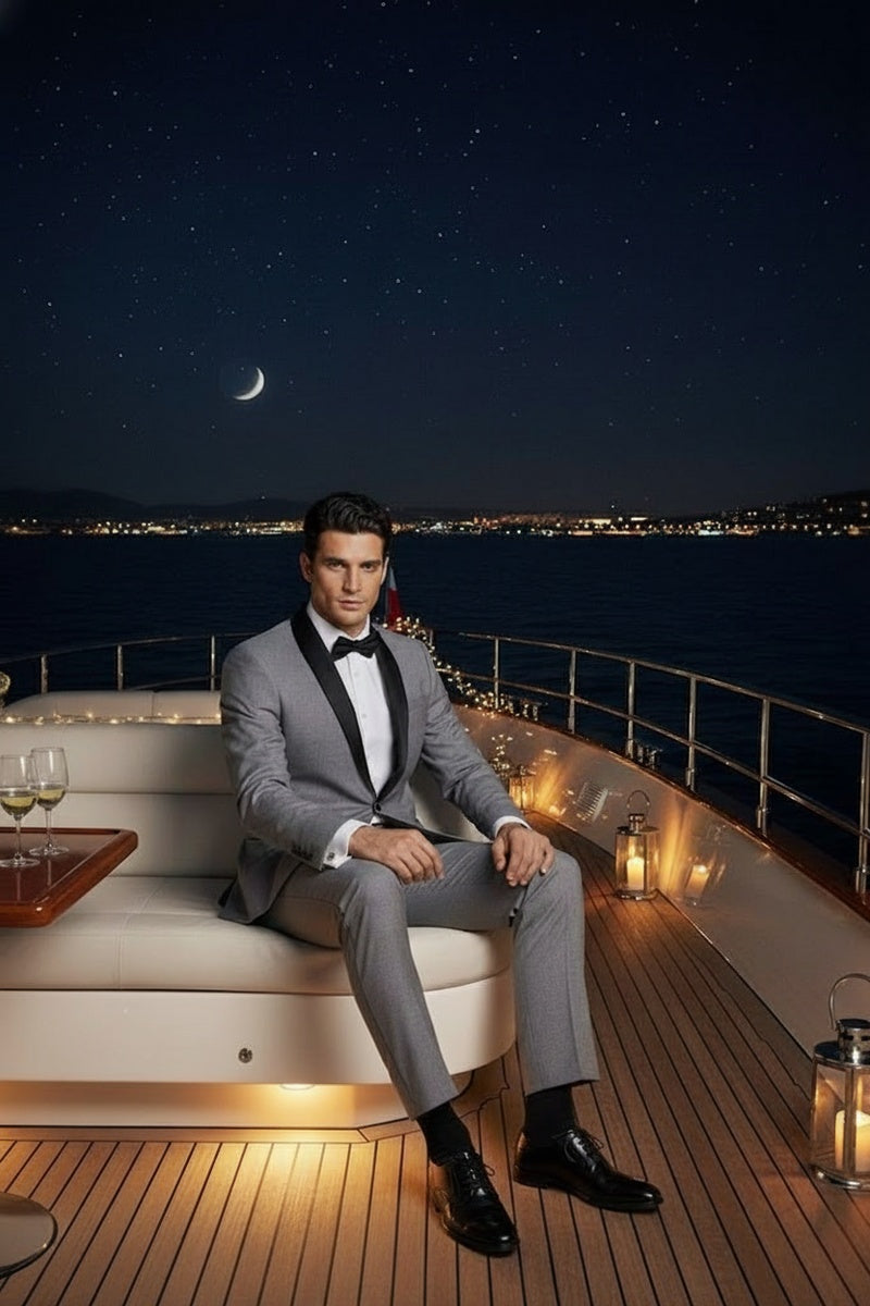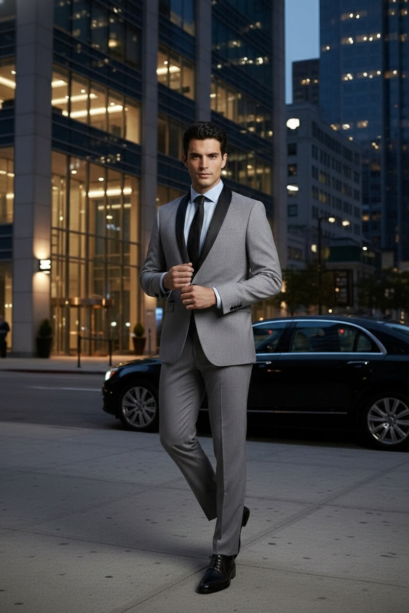 The Paris Grey Tuxedo, designed by Renoir, is hand-tailored in a signature slim fit and crafted using a Super 150's luxury viscose blend fabric. The relatively high thread count of this viscose blend fabric ensures a soft, luxurious feel that one would expect from Renoir. The front of the jacket features shawl lapels which are detailed in a black premium satin. The front enclosure features one button and while the dual lower front besom pockets. A top welt pocket is located on the left side of the jacket to properly store a pocket square. Darts stitched down the front of the jacket are tailored to perfection giving a desired tapered shape to the garment. Towards the cuff of each jacket sleeve, there are vented sleeves with satin-faced buttons once again showing that no details were overlooked in design. Lastly, let's not forget the interior of the jacket. Silky soft interior lining complemented with plenty of pocket storage provides an ultra comfortable formal wear experience.