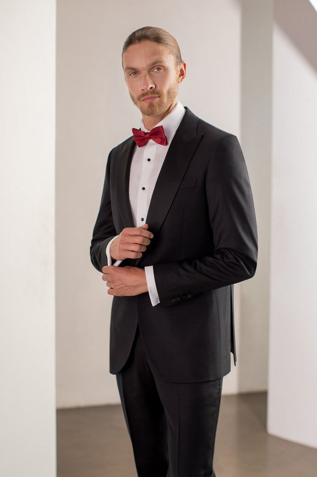 The Davoli Peak Tuxedo, designed by MaxDavoli, is hand-tailored in a signature modern fit and crafted using a Super 150's luxury wool fabric. The relatively high thread count of this 100% wool fabric ensures a soft, luxurious feel that one would expect from MaxDavoli. The front of the jacket features peak lapels which are detailed in a black premium satin. The front enclosure features one button wrapped in coordinating black satin fabric while the dual lower front besom pockets, highlighted in the same black satin fabric, unify the look. A top welt pocket is located on the left side of the jacket to properly store a pocket square. Darts stitched down the front of the jacket are tailored to perfection giving a desired tapered shape to the garment. Towards the cuff of each jacket sleeve, there are vented sleeves with satin-faced buttons once again showing that no details were overlooked in design. Lastly, let's not forget the interior of the jacket. Silky soft interior lining complemented with plenty of pocket storage provides an ultra comfortable formal wear experience.