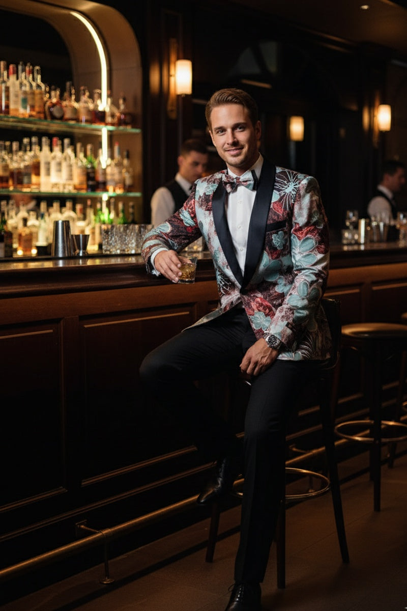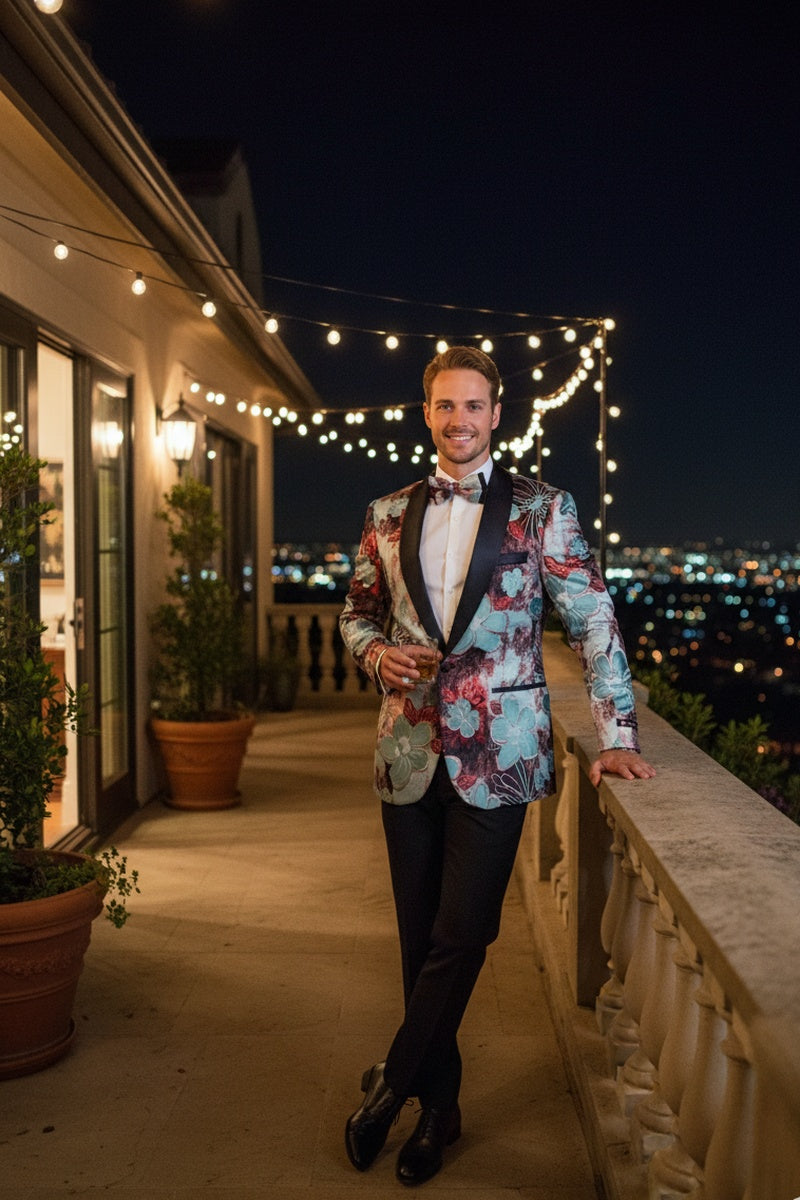 "Monte Carlo" Red Tuxedo Jacket, designed by Xander Xiao, is crafted using a beautiful woven fabric in an intricate modern floral pattern.