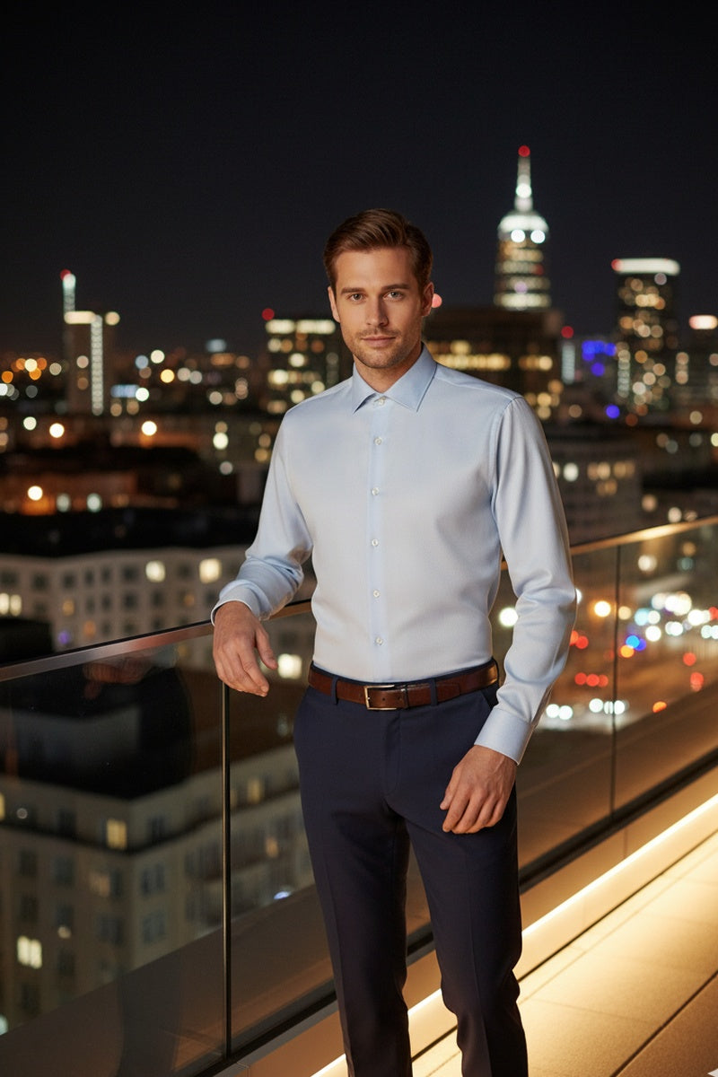 The "Jamison" Blue Spread Collar Shirt isa perfect shirt to go with a wedding suit.The 100% cotton twill fabric has a beautiful subtle diagonal texture and is soft, lightweight, breathable and comfortable. Break-stitch resistant buttons and single-needle tailoring showcase the attention to detail and premium craftsmanship. A Flex Fit collar providesthe desired level of comfortaround the neck.