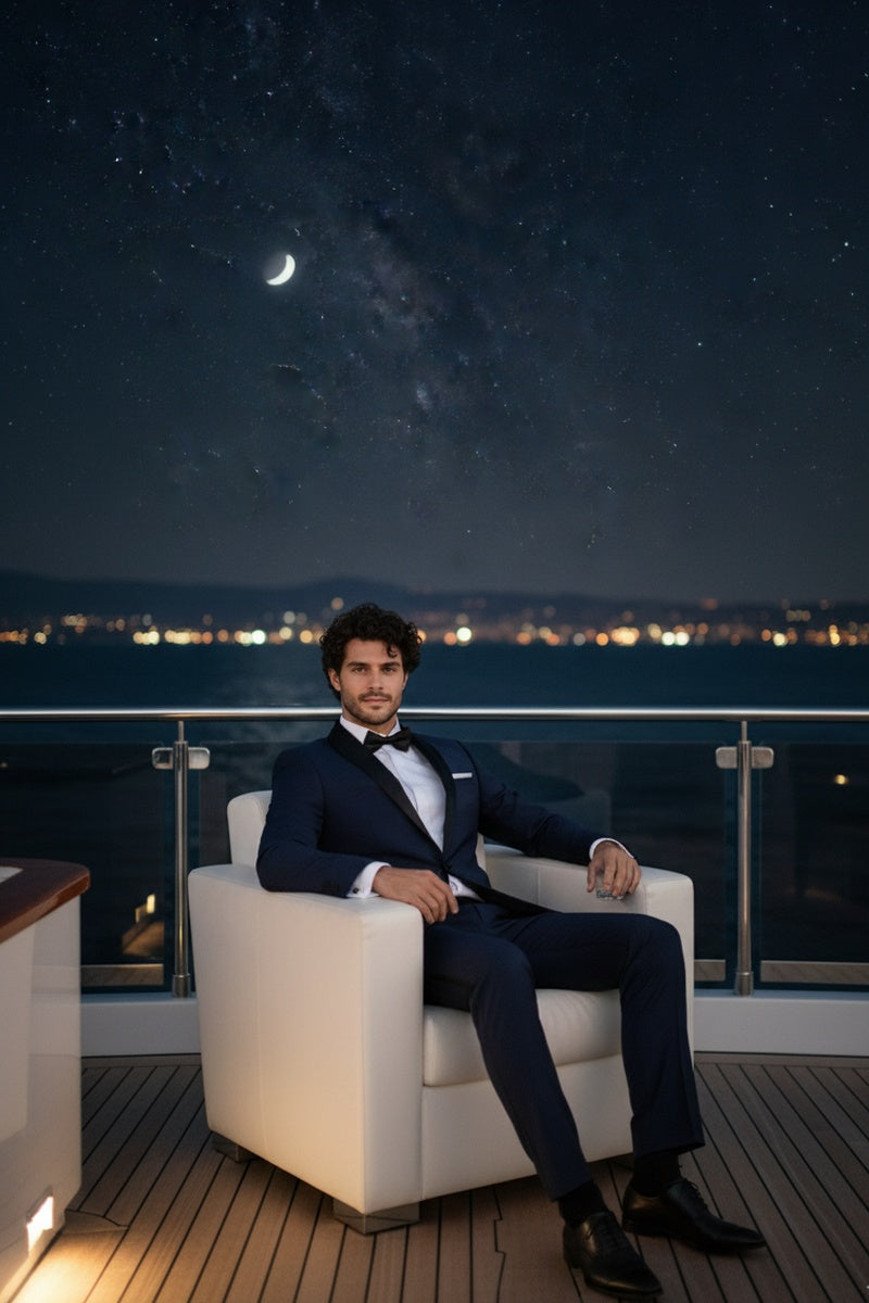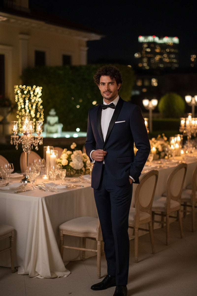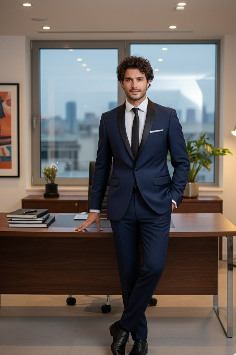 The Paris Navy Tuxedo, designed by Renoir, is hand-tailored in a signature slim fit and crafted using a Super 150's luxury viscose blend fabric. The relatively high thread count of this viscose blend fabric ensures a soft, luxurious feel that one would expect from Renoir. The front of the jacket features shawl lapels which are detailed in a black premium satin. The front enclosure features one button and while the dual lower front besom pockets. A top welt pocket is located on the left side of the jacket to properly store a pocket square. Darts stitched down the front of the jacket are tailored to perfection giving a desired tapered shape to the garment. Towards the cuff of each jacket sleeve, there are vented sleeves with satin-faced buttons once again showing that no details were overlooked in design. Lastly, let's not forget the interior of the jacket. Silky soft interior lining complemented with plenty of pocket storage provides an ultra comfortable formal wear experience.