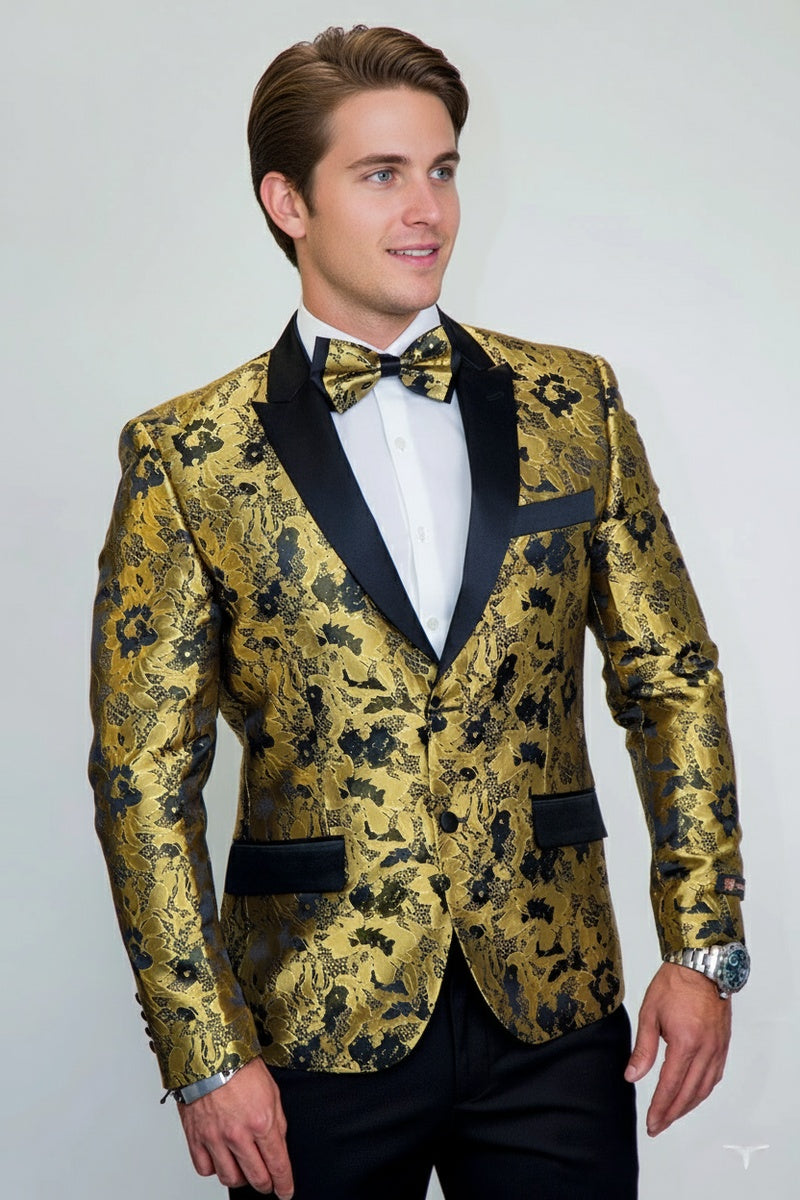 "Amsterdam" Gold Tuxedo Jacket, designed by Xander Xiao, is crafted using a beautiful woven fabric in an intricate modern floral pattern.