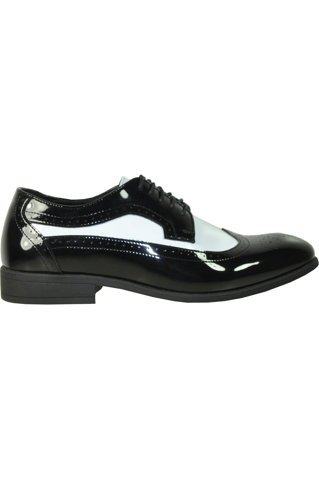 The Telford is a Classic Wingtip Oxford Style Two-Toned Patent Shoe. The Black and White color is accentuated with a unique design on the vamp of the shoe giving it some extra flair. The lace up style allows for individualized comfort and the odor free stitched outsole with a stapled heel provides an overall sophistication when one is wearing the Telford.