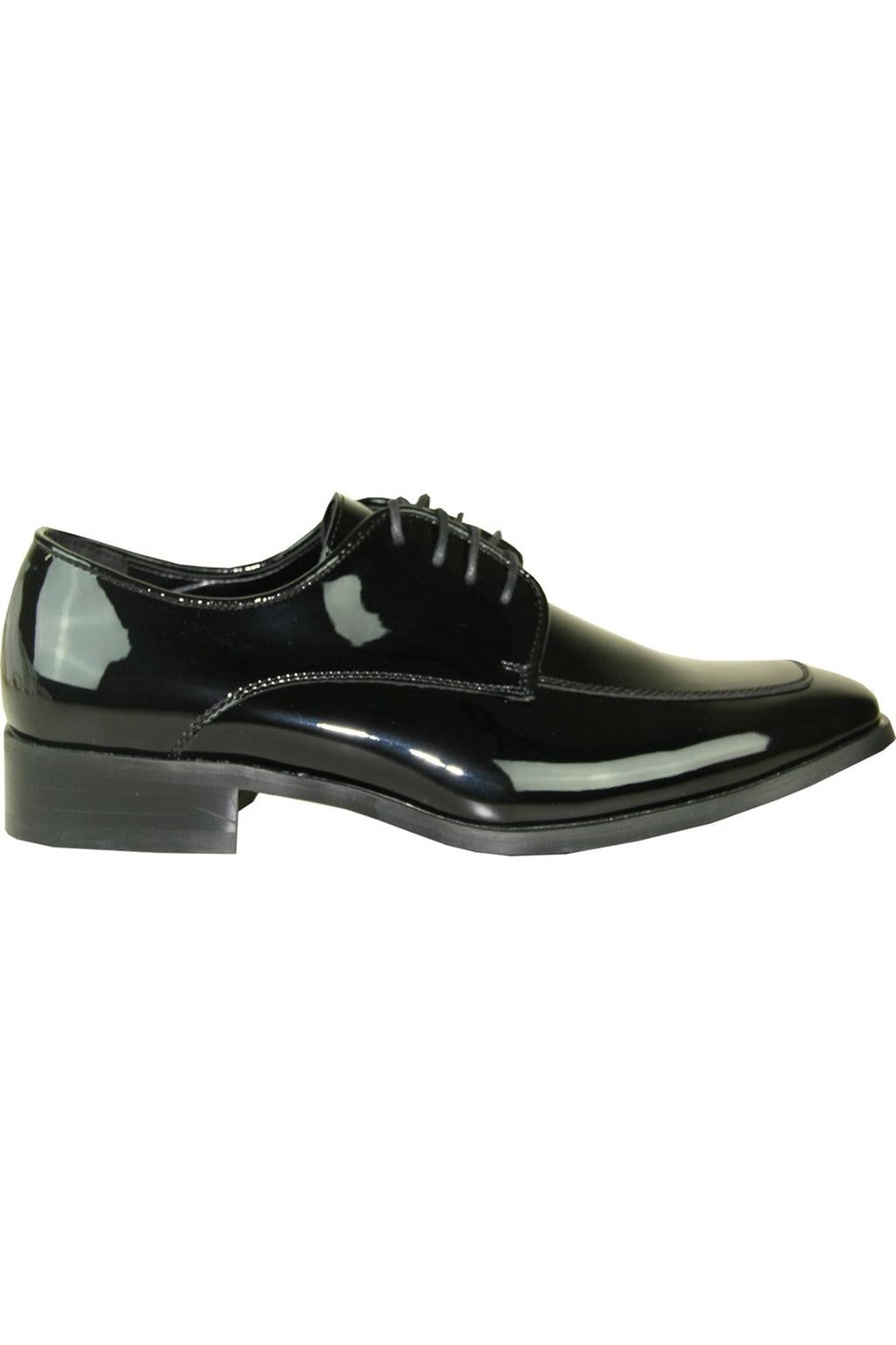 The Vittorio is a Black Patent Fashion Moc Toe Tuxedo Shoe designed by Vangelo. This classic lace up style was made from a never-creasing and easy to clean scruff material. The Vittorio includes twin elastic goring panels and an odor free stitched-in sole for comfort during long-time wear. This classic tuxedo shoe pairs well with your favorite tuxedo for a traditional and polished look.