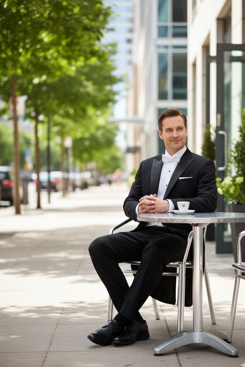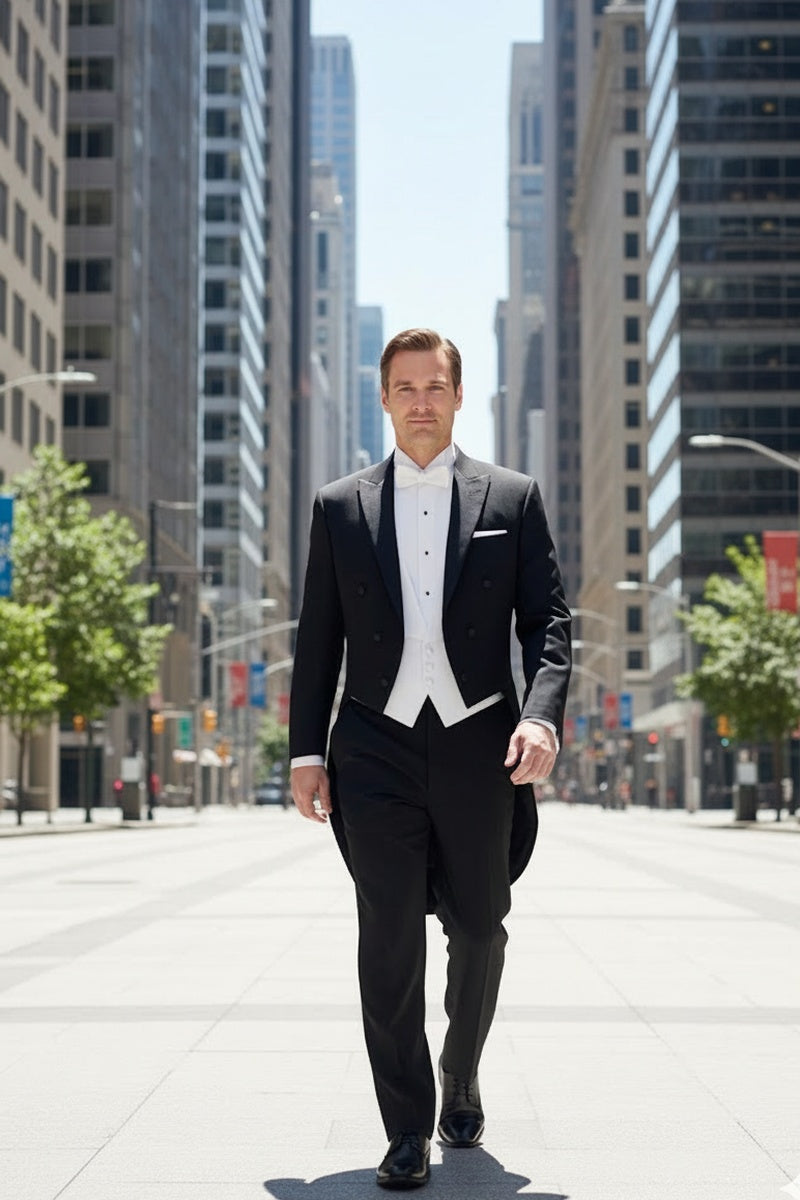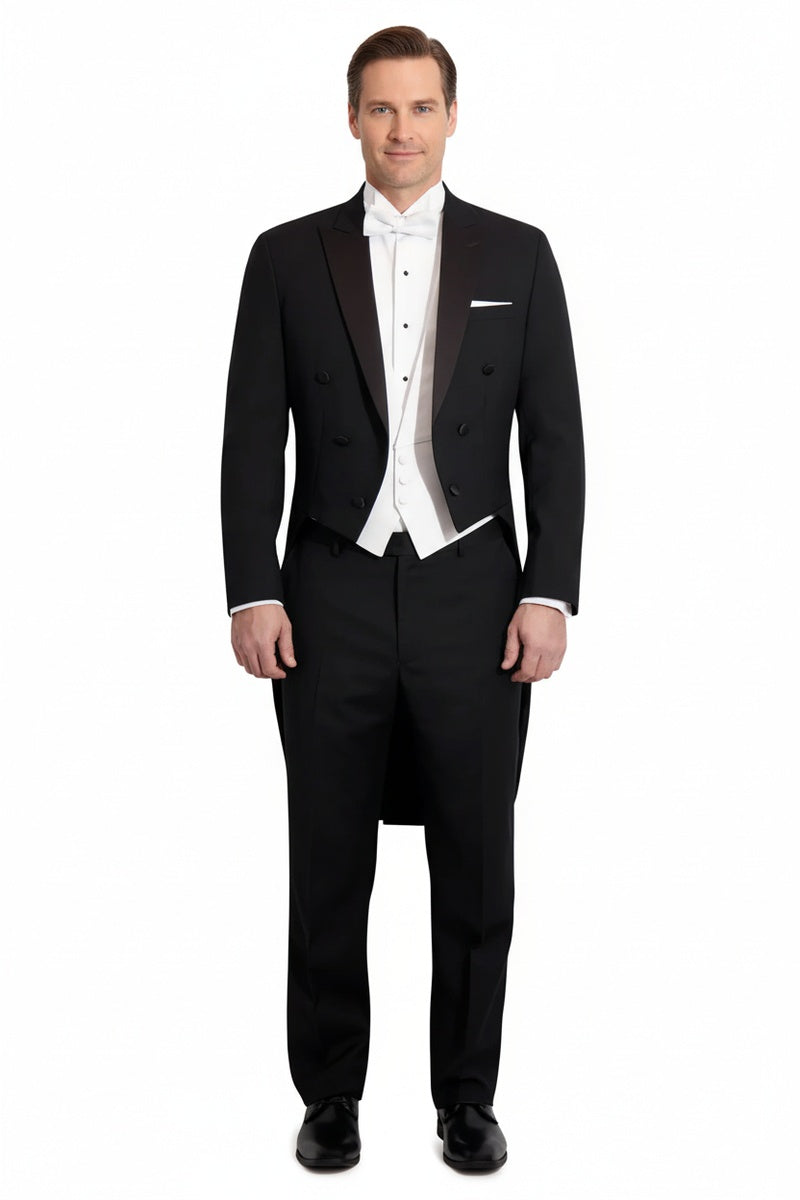 COMPANION PANTS: The pants that were designed to go with this "Edward" Black Tailcoat Jacket is the "Washington" Black Tuxedo Pants, featuring an updated 1/8" narrow satin stripe going down the outer side of each leg.