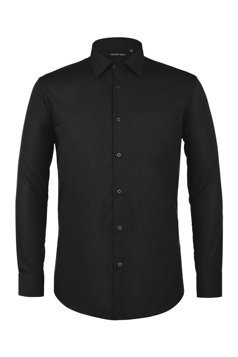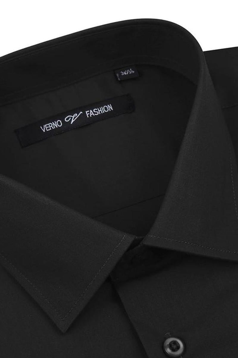 The "Icon" Black Laydown Dress Shirt by Verno Fashion, crafted from a cotton blend fabric, is both light weight and comfortable. The laydown collar is a traditional design that pairs perfectly with either a bow tie or necktie.