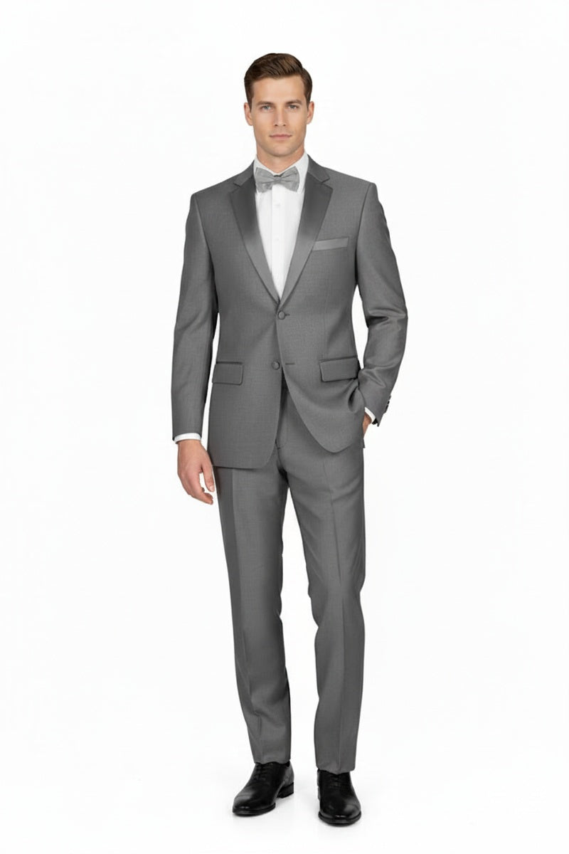 The Giorgio Grey Tuxedo, designed by Vinci, is hand-tailored in a signature slim fit and crafted using a Super 150's luxury viscose blend fabric. The relatively high thread count of this viscose blend fabric ensures a soft, luxurious feel that one would expect from Vinci. The front of the jacket features notch lapels which are detailed in a grey premium satin. The front enclosure features two buttons wrapped in coordinating grey satin fabric while the dual lower front besom pockets, highlighted in the same grey satin fabric, unify the look. A top welt pocket is located on the left side of the jacket to properly store a pocket square. Darts stitched down the front of the jacket are tailored to perfection giving a desired tapered shape to the garment. Towards the cuff of each jacket sleeve, there are vented sleeves with satin-faced buttons once again showing that no details were overlooked in design. As we rotate towards the back of the jacket, we notice dual side vents providing a modern, updated look. Lastly, let's not forget the interior of the jacket. Silky soft interior lining complemented with plenty of pocket storage provides an ultra comfortable formal wear experience.