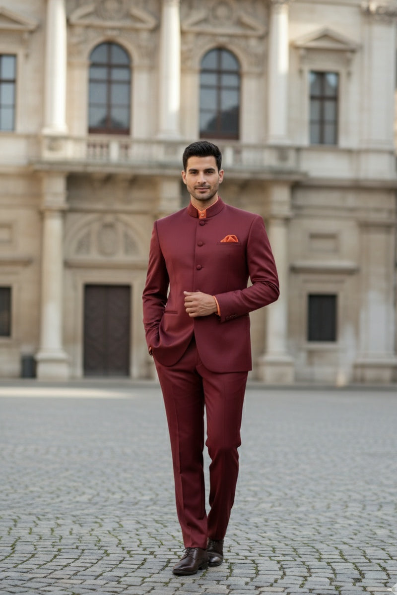 The "Mandarin" Burgundy Suit, designed by Vinci, is hand-tailored in a classic fit and crafted using a Super 150's luxury viscose blend fabric. The relatively high thread count of this viscose blend fabric ensures a soft, luxurious feel that one would expect from Vinci. The front of the jacket features a mandarin design with a 5-button front enclosure. A top welt pocket is located on the left side of the jacket to properly store a pocket square. Towards the cuff of each jacket sleeve, there are vented sleeves with satin-faced buttons once again showing that no details were overlooked in design. As we rotate towards the back of the jacket, we notice dual side vents providing a modern, updated look. Lastly, let's not forget the interior of the jacket. Silky soft interior lining complemented with plenty of pocket storage provides an ultra comfortable formal wear experience.