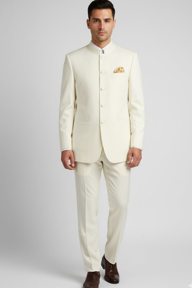 The "Mandarin" Ivory Suit, designed by Vinci, is hand-tailored in a classic fit and crafted using a Super 150's luxury viscose blend fabric. The relatively high thread count of this viscose blend fabric ensures a soft, luxurious feel that one would expect from Vinci. The front of the jacket features a mandarin design with a 5-button front enclosure. A top welt pocket is located on the left side of the jacket to properly store a pocket square. Towards the cuff of each jacket sleeve, there are vented sleeves with satin-faced buttons once again showing that no details were overlooked in design. As we rotate towards the back of the jacket, we notice dual side vents providing a modern, updated look. Lastly, let's not forget the interior of the jacket. Silky soft interior lining complemented with plenty of pocket storage provides an ultra comfortable formal wear experience.