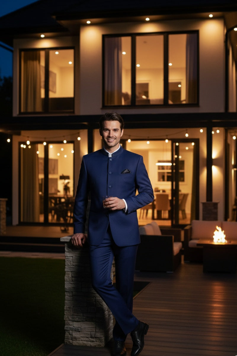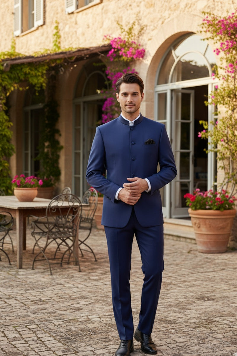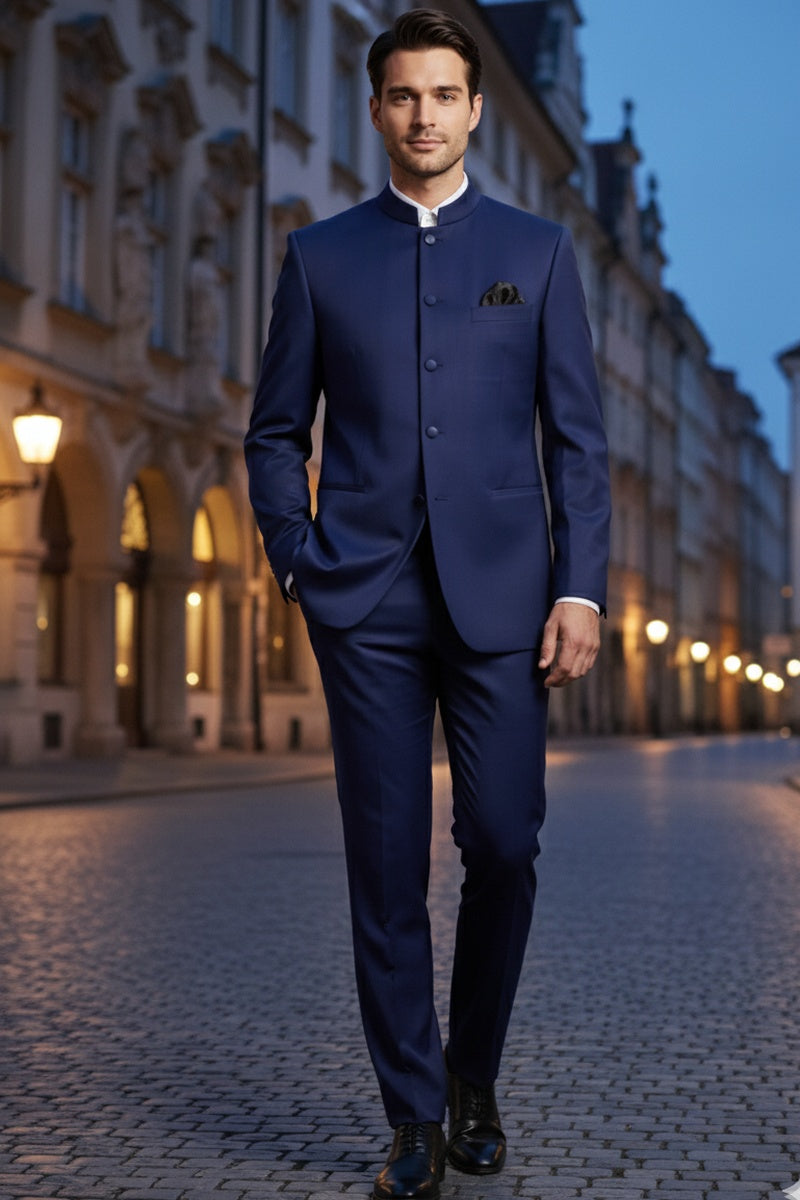 The "Mandarin" Navy Suit, designed by Vinci, is hand-tailored in a classic fit and crafted using a Super 150's luxury viscose blend fabric. The relatively high thread count of this viscose blend fabric ensures a soft, luxurious feel that one would expect from Vinci. The front of the jacket features a mandarin design with a 5-button front enclosure. A top welt pocket is located on the left side of the jacket to properly store a pocket square. Towards the cuff of each jacket sleeve, there are vented sleeves with satin-faced buttons once again showing that no details were overlooked in design. As we rotate towards the back of the jacket, we notice dual side vents providing a modern, updated look. Lastly, let's not forget the interior of the jacket. Silky soft interior lining complemented with plenty of pocket storage provides an ultra comfortable formal wear experience.