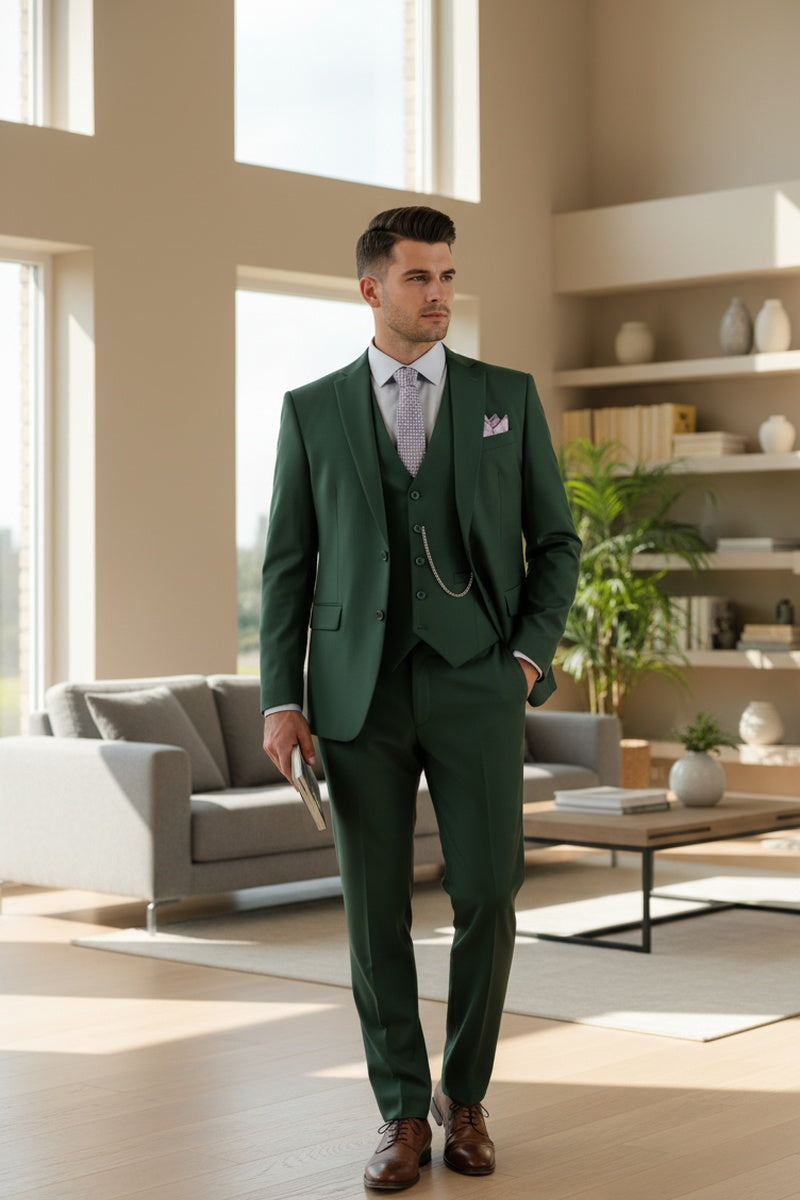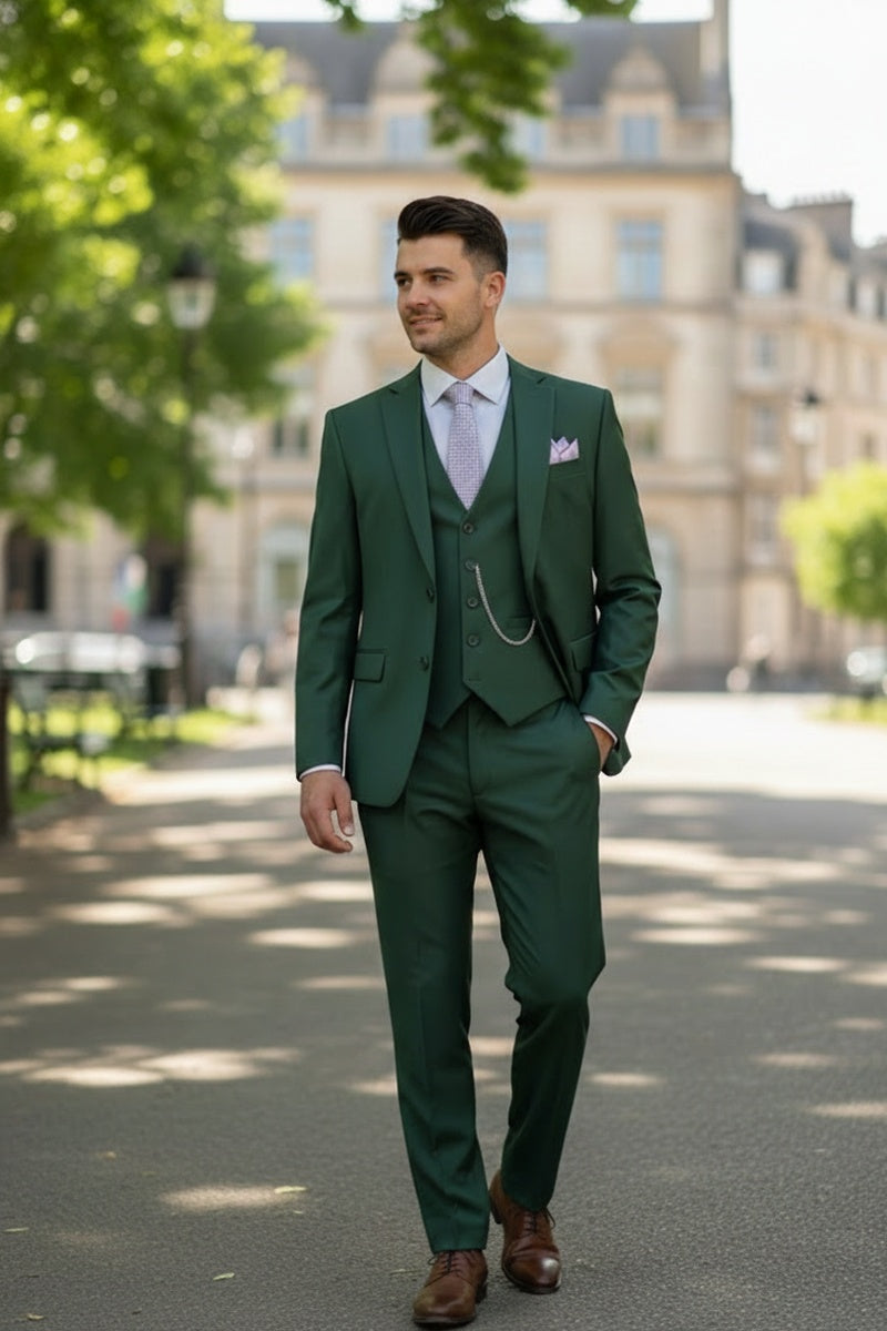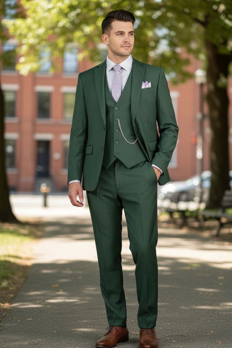 The "Preston" Hunter Suit, designed by Vinci, is hand-tailored in a signature slim fit and crafted using a Super 150's luxury viscose blend fabric. The relatively high thread count of this viscose blend fabric ensures a soft, luxurious feel that one would expect from Vinci. The front of the jacket features notch lapels with a 2-button front enclosure. A top welt pocket is located on the left side of the jacket to properly store a pocket square. Darts stitched down the front of the jacket are tailored to perfection giving a desired tapered shape to the garment. Towards the cuff of each jacket sleeve, there are vented sleeves with satin-faced buttons once again showing that no details were overlooked in design. As we rotate towards the back of the jacket, we notice dual side vents providing a modern, updated look. Lastly, let's not forget the interior of the jacket. Silky soft interior lining complemented with plenty of pocket storage provides an ultra comfortable formal wear experience.