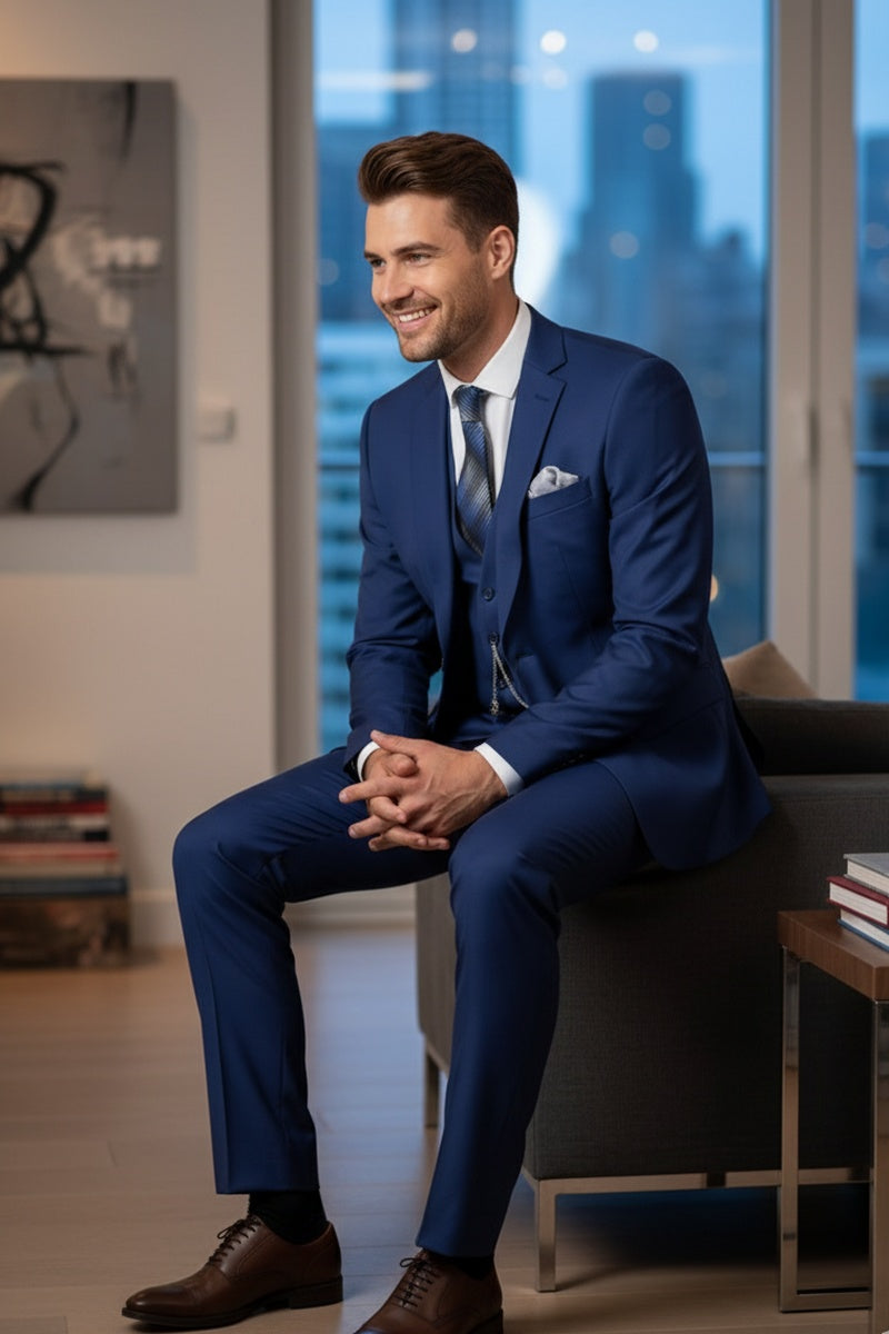 The "Preston" Twilight Blue Suit, designed by Vinci, is hand-tailored in a signature slim fit and crafted using a Super 150's luxury viscose blend fabric. The relatively high thread count of this viscose blend fabric ensures a soft, luxurious feel that one would expect from Vinci. The front of the jacket features notch lapels with a 2-button front enclosure. A top welt pocket is located on the left side of the jacket to properly store a pocket square. Darts stitched down the front of the jacket are tailored to perfection giving a desired tapered shape to the garment. Towards the cuff of each jacket sleeve, there are vented sleeves with satin-faced buttons once again showing that no details were overlooked in design. As we rotate towards the back of the jacket, we notice dual side vents providing a modern, updated look. Lastly, let's not forget the interior of the jacket. Silky soft interior lining complemented with plenty of pocket storage provides an ultra comfortable formal wear experience.