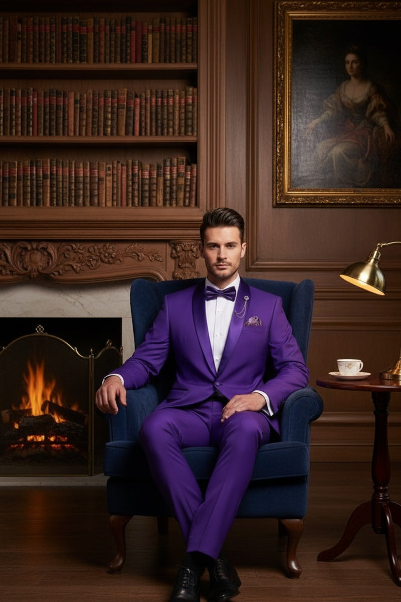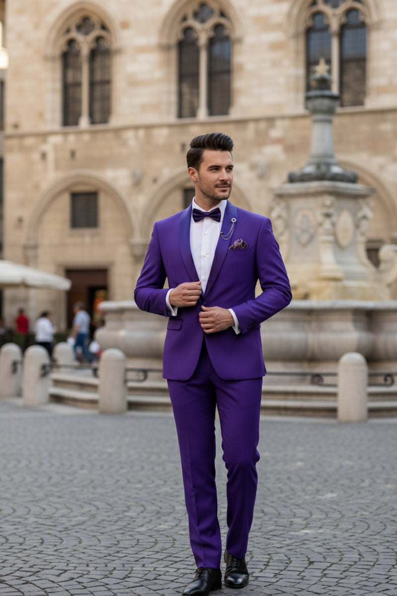 The "Spectrum" Royal Purple Tuxedo, designed by Vinci, is hand-tailored in a signature slim fit and crafted using a Super 150's luxury viscose blend fabric. The relatively high thread count of this viscose blend fabric ensures a soft, luxurious feel that one would expect from Vinci. The front of the jacket features shawl lapels which are detailed in a premium satin. The front enclosure features one button wrapped in coordinating satin fabric while the dual lower front besom pockets, highlighted in the same black satin fabric, unify the look. A top welt pocket is located on the left side of the jacket to properly store a pocket square. Darts stitched down the front of the jacket are tailored to perfection giving a desired tapered shape to the garment. Towards the cuff of each jacket sleeve, there are vented sleeves with satin-faced buttons once again showing that no details were overlooked in design. As we rotate towards the back of the jacket, we notice dual side vents providing a modern, updated look. Lastly, let's not forget the interior of the jacket. Silky soft interior lining complemented with plenty of pocket storage provides an ultra comfortable formal wear experience.