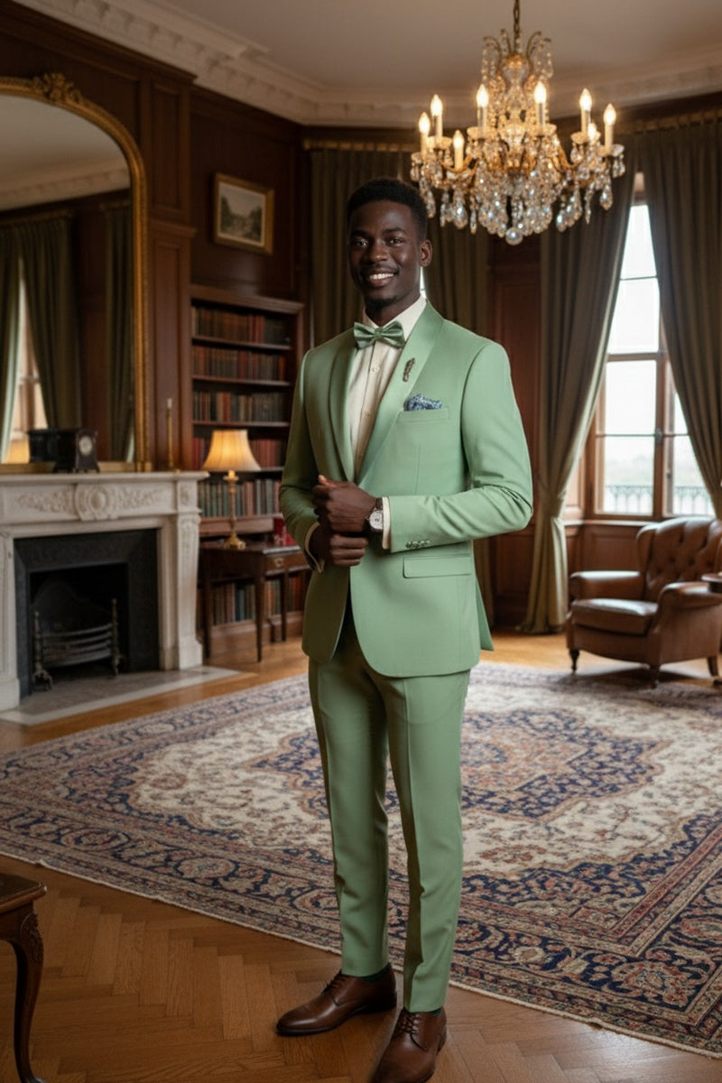 The "Spectrum" Sage Tuxedo, designed by Vinci, is hand-tailored in a signature slim fit and crafted using a Super 150's luxury viscose blend fabric. The relatively high thread count of this viscose blend fabric ensures a soft, luxurious feel that one would expect from Vinci. The front of the jacket features shawl lapels which are detailed in a premium satin. The front enclosure features one button wrapped in coordinating satin fabric while the dual lower front besom pockets, highlighted in the same black satin fabric, unify the look. A top welt pocket is located on the left side of the jacket to properly store a pocket square. Darts stitched down the front of the jacket are tailored to perfection giving a desired tapered shape to the garment. Towards the cuff of each jacket sleeve, there are vented sleeves with satin-faced buttons once again showing that no details were overlooked in design. As we rotate towards the back of the jacket, we notice dual side vents providing a modern, updated look. Lastly, let's not forget the interior of the jacket. Silky soft interior lining complemented with plenty of pocket storage provides an ultra comfortable formal wear experience.