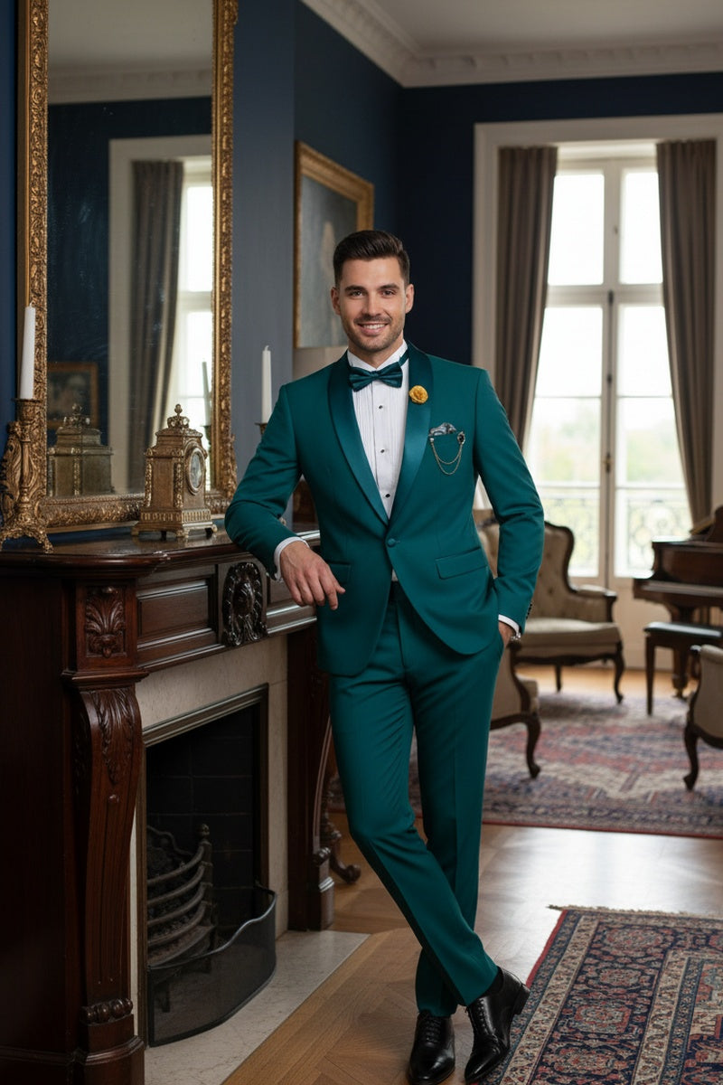 The "Spectrum" Teal Tuxedo, designed by Vinci, is hand-tailored in a signature slim fit and crafted using a Super 150's luxury viscose blend fabric. The relatively high thread count of this viscose blend fabric ensures a soft, luxurious feel that one would expect from Vinci. The front of the jacket features shawl lapels which are detailed in a premium satin. The front enclosure features one button wrapped in coordinating satin fabric while the dual lower front besom pockets, highlighted in the same black satin fabric, unify the look. A top welt pocket is located on the left side of the jacket to properly store a pocket square. Darts stitched down the front of the jacket are tailored to perfection giving a desired tapered shape to the garment. Towards the cuff of each jacket sleeve, there are vented sleeves with satin-faced buttons once again showing that no details were overlooked in design. As we rotate towards the back of the jacket, we notice dual side vents providing a modern, updated look. Lastly, let's not forget the interior of the jacket. Silky soft interior lining complemented with plenty of pocket storage provides an ultra comfortable formal wear experience.