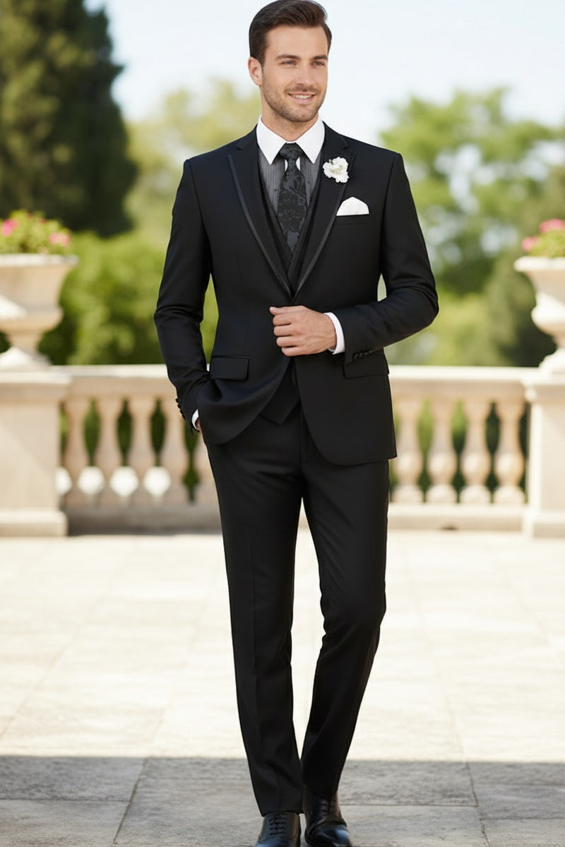 The "Syracuse" Black Tuxedo, designed by Vinci, is hand-tailored in a signature slim fit and crafted using a Super 150's luxury viscose blend fabric. The relatively high thread count of this viscose blend fabric ensures a soft, luxurious feel that one would expect from Vinci. The front of the jacket features notch lapels which are detailed in a black premium satin trim. The front enclosure features two buttons wrapped in coordinating black satin fabric while the dual lower front besom pockets, highlighted in the same black satin fabric, unify the look. A top welt pocket is located on the left side of the jacket to properly store a pocket square. Darts stitched down the front of the jacket are tailored to perfection giving a desired tapered shape to the garment. Towards the cuff of each jacket sleeve, there are vented sleeves with satin-faced buttons once again showing that no details were overlooked in design. As we rotate towards the back of the jacket, we notice dual side vents providing a modern, updated look. Lastly, let's not forget the interior of the jacket. Silky soft interior lining complemented with plenty of pocket storage provides an ultra comfortable formal wear experience.