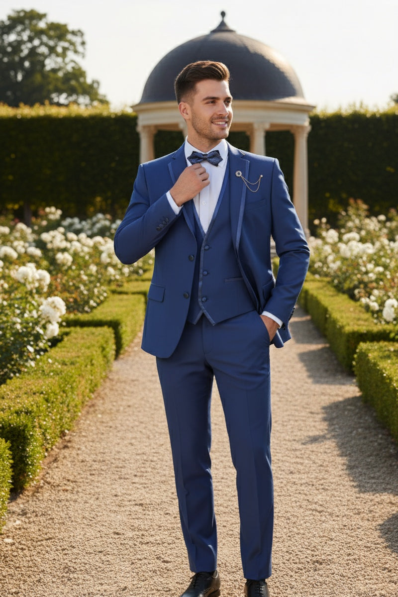 The "Syracuse" Blue Tuxedo, designed by Vinci, is hand-tailored in a signature slim fit and crafted using a Super 150's luxury viscose blend fabric. The relatively high thread count of this viscose blend fabric ensures a soft, luxurious feel that one would expect from Vinci. The front of the jacket features notch lapels which are detailed in a coordinating blue premium satin trim. The front enclosure features two buttons wrapped in coordinating satin fabric while the dual lower front besom pockets, highlighted in the same satin fabric, unify the look. A top welt pocket is located on the left side of the jacket to properly store a pocket square. Darts stitched down the front of the jacket are tailored to perfection giving a desired tapered shape to the garment. Towards the cuff of each jacket sleeve, there are vented sleeves with satin-faced buttons once again showing that no details were overlooked in design. As we rotate towards the back of the jacket, we notice dual side vents providing a modern, updated look. Lastly, let's not forget the interior of the jacket. Silky soft interior lining complemented with plenty of pocket storage provides an ultra comfortable formal wear experience.