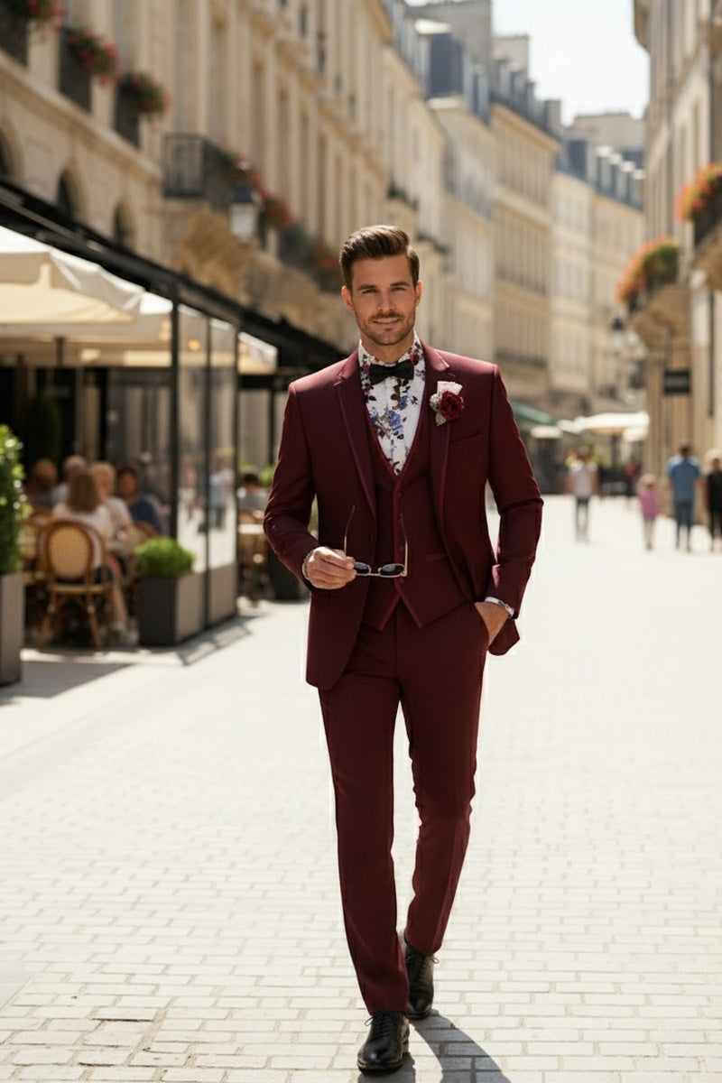 The "Syracuse" Burgundy Tuxedo, designed by Vinci, is hand-tailored in a signature slim fit and crafted using a Super 150's luxury viscose blend fabric. The relatively high thread count of this viscose blend fabric ensures a soft, luxurious feel that one would expect from Vinci. The front of the jacket features notch lapels which are detailed in a coordinating burgundy premium satin trim. The front enclosure features two buttons wrapped in coordinating satin fabric while the dual lower front besom pockets, highlighted in the same satin fabric, unify the look. A top welt pocket is located on the left side of the jacket to properly store a pocket square. Darts stitched down the front of the jacket are tailored to perfection giving a desired tapered shape to the garment. Towards the cuff of each jacket sleeve, there are vented sleeves with satin-faced buttons once again showing that no details were overlooked in design. As we rotate towards the back of the jacket, we notice dual side vents providing a modern, updated look. Lastly, let's not forget the interior of the jacket. Silky soft interior lining complemented with plenty of pocket storage provides an ultra comfortable formal wear experience.