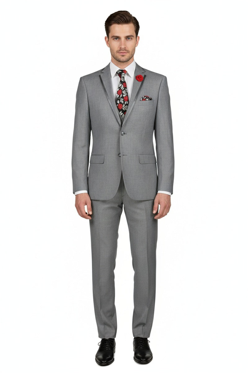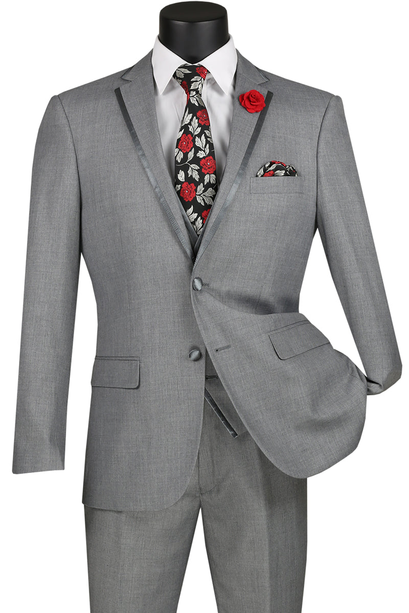 The "Syracuse" Light Grey Tuxedo, designed by Vinci, is hand-tailored in a signature slim fit and crafted using a Super 150's luxury viscose blend fabric. The relatively high thread count of this viscose blend fabric ensures a soft, luxurious feel that one would expect from Vinci. The front of the jacket features notch lapels which are detailed in a coordinating light grey premium satin trim. The front enclosure features two buttons wrapped in coordinating satin fabric while the dual lower front besom pockets, highlighted in the same satin fabric, unify the look. A top welt pocket is located on the left side of the jacket to properly store a pocket square. Darts stitched down the front of the jacket are tailored to perfection giving a desired tapered shape to the garment. Towards the cuff of each jacket sleeve, there are vented sleeves with satin-faced buttons once again showing that no details were overlooked in design. As we rotate towards the back of the jacket, we notice dual side vents providing a modern, updated look. Lastly, let's not forget the interior of the jacket. Silky soft interior lining complemented with plenty of pocket storage provides an ultra comfortable formal wear experience.