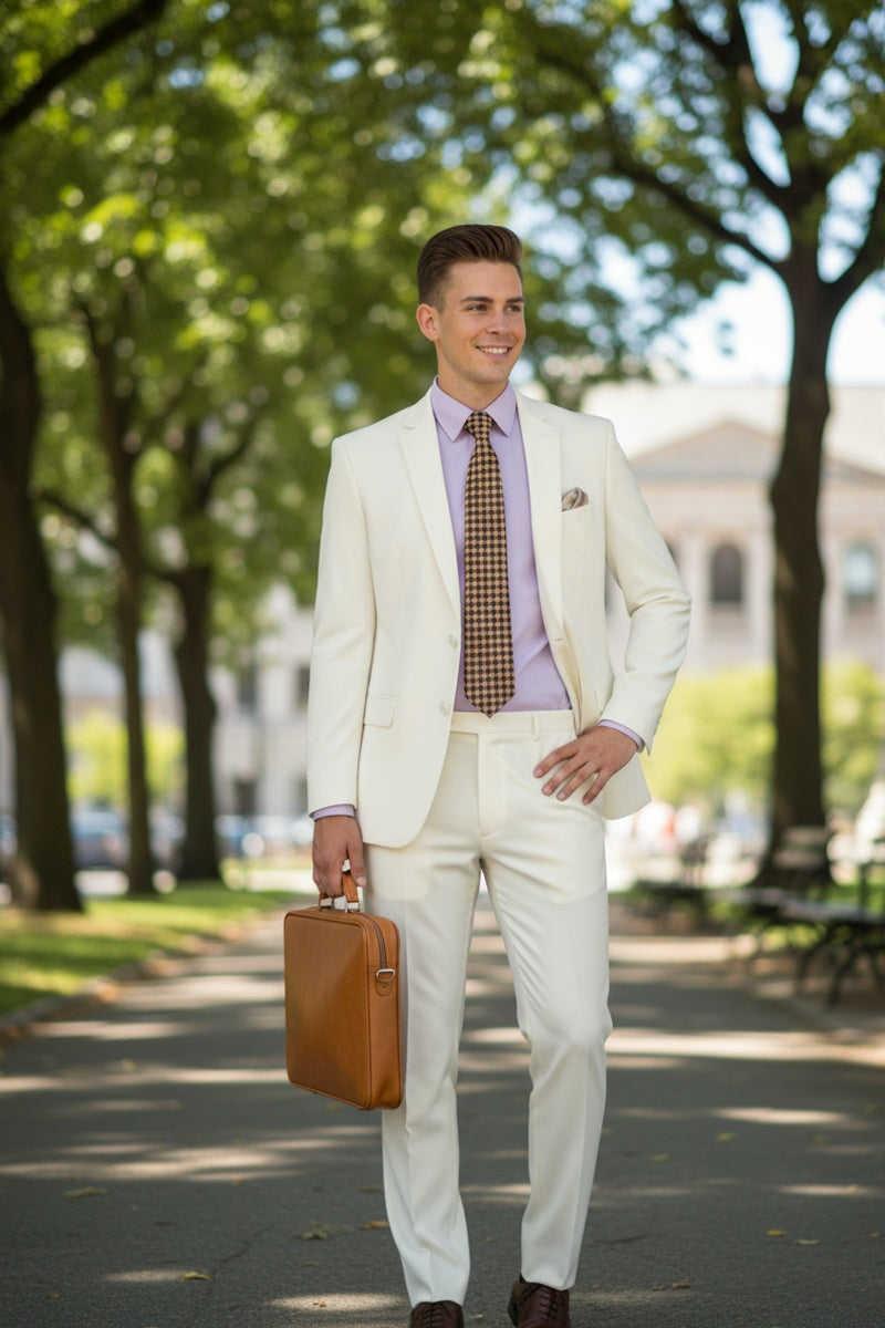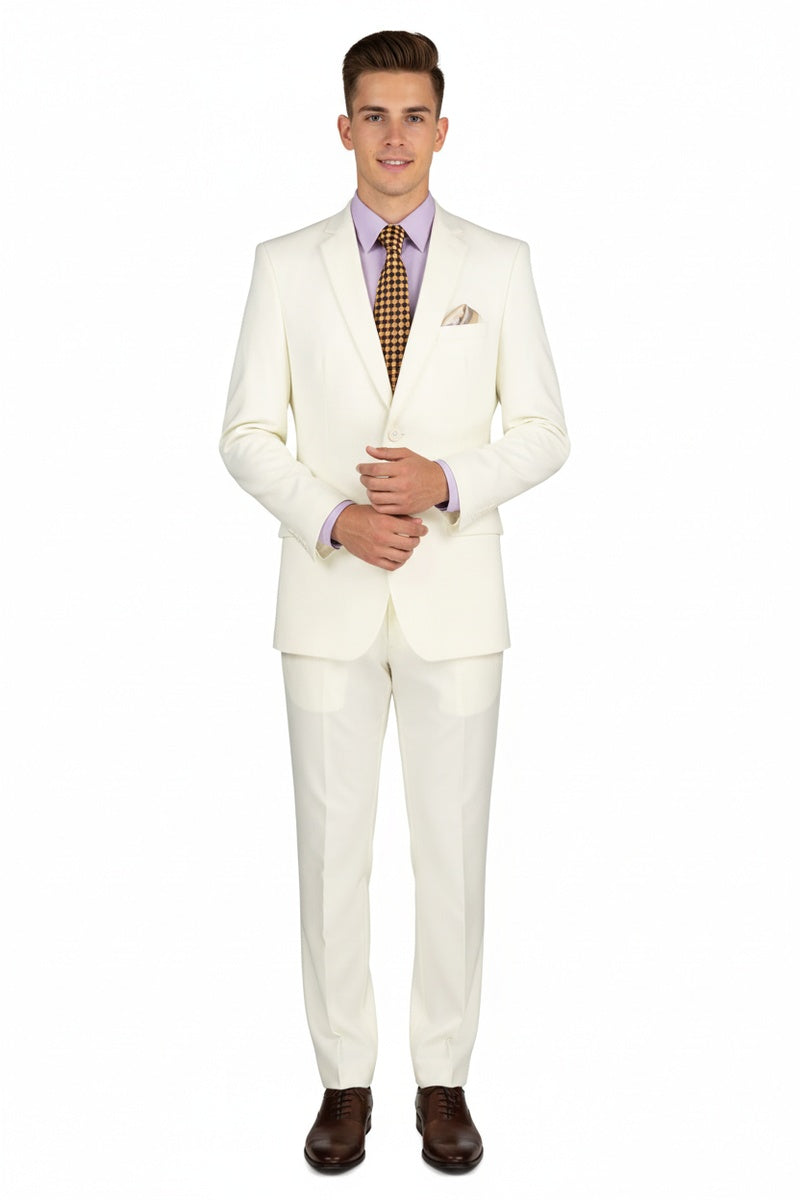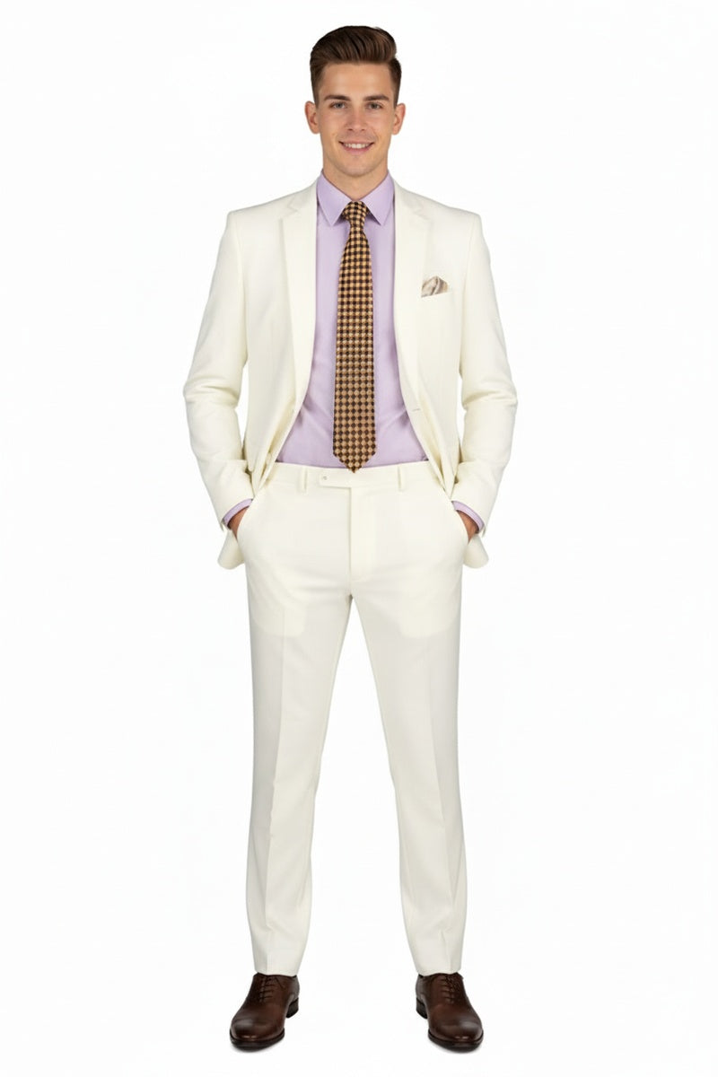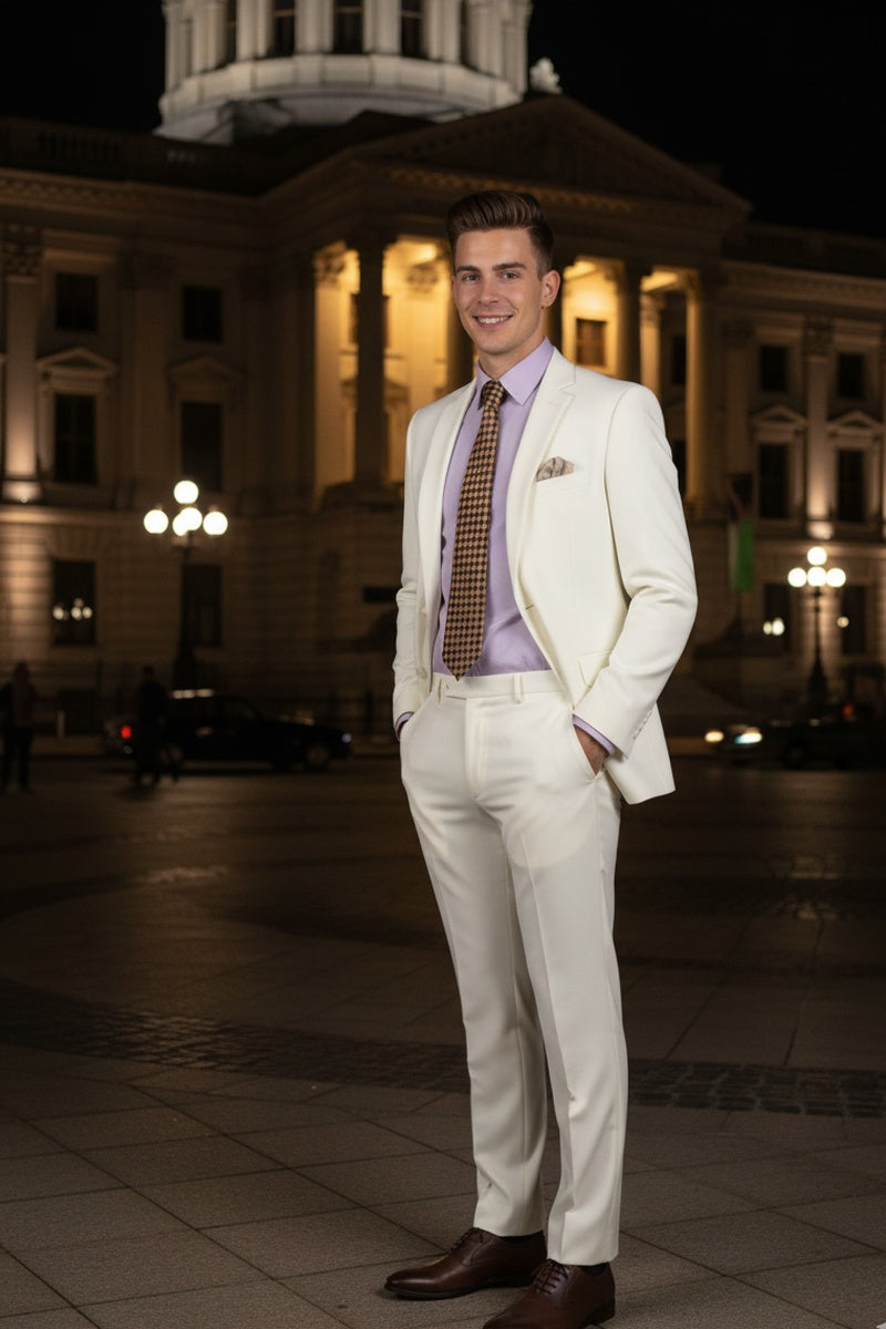 The Versafit Ivory Suit, designed by Vinci, is hand-tailored in a signature slim fit and crafted using a 100% poplin dacron fabric. The front of the jacket features notch lapels, two front buttons, and dual lower front besom pockets. A top welt pocket is located on the left side of the jacket to properly store a pocket square. Darts stitched down the front of the jacket are tailored to perfection giving a desired tapered shape to the garment. Towards the cuff of each jacket sleeve, there are vented sleeves for a more tailored, distinguished look. As we rotate towards the back of the jacket, we notice dual side vents providing a modern, updated look. Lastly, let's not forget the interior of the jacket. Silky soft interior lining complemented with plenty of pocket storage provides an ultra comfortable formal wear experience.