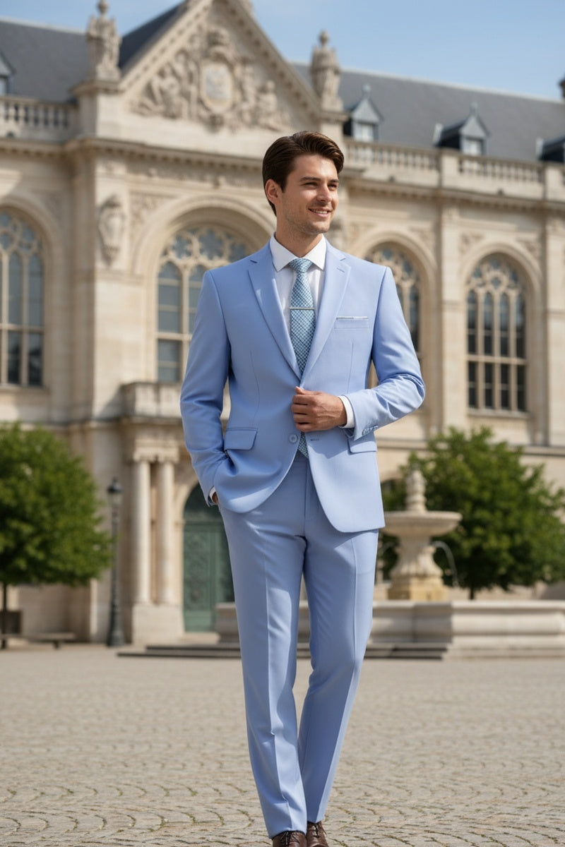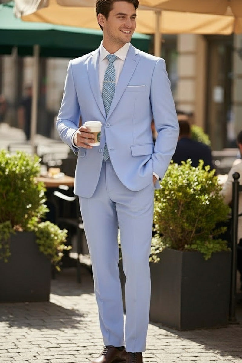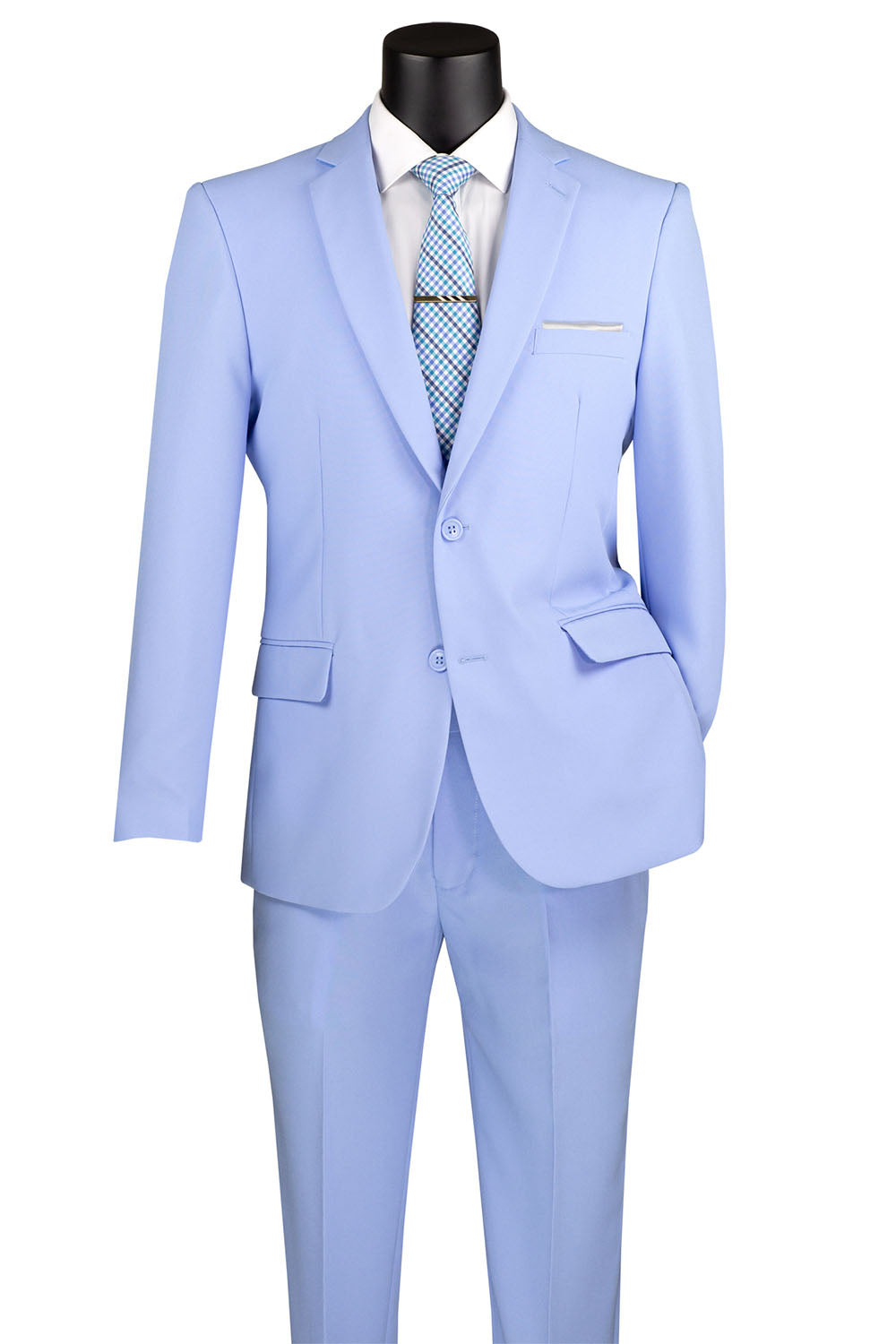 The Versafit Light Blue Suit, designed by Vinci, is hand-tailored in a signature slim fit and crafted using a 100% poplin dacron fabric. The front of the jacket features notch lapels, two front buttons, and dual lower front besom pockets. A top welt pocket is located on the left side of the jacket to properly store a pocket square. Darts stitched down the front of the jacket are tailored to perfection giving a desired tapered shape to the garment. Towards the cuff of each jacket sleeve, there are vented sleeves for a more tailored, distinguished look. As we rotate towards the back of the jacket, we notice dual side vents providing a modern, updated look. Lastly, let's not forget the interior of the jacket. Silky soft interior lining complemented with plenty of pocket storage provides an ultra comfortable formal wear experience.