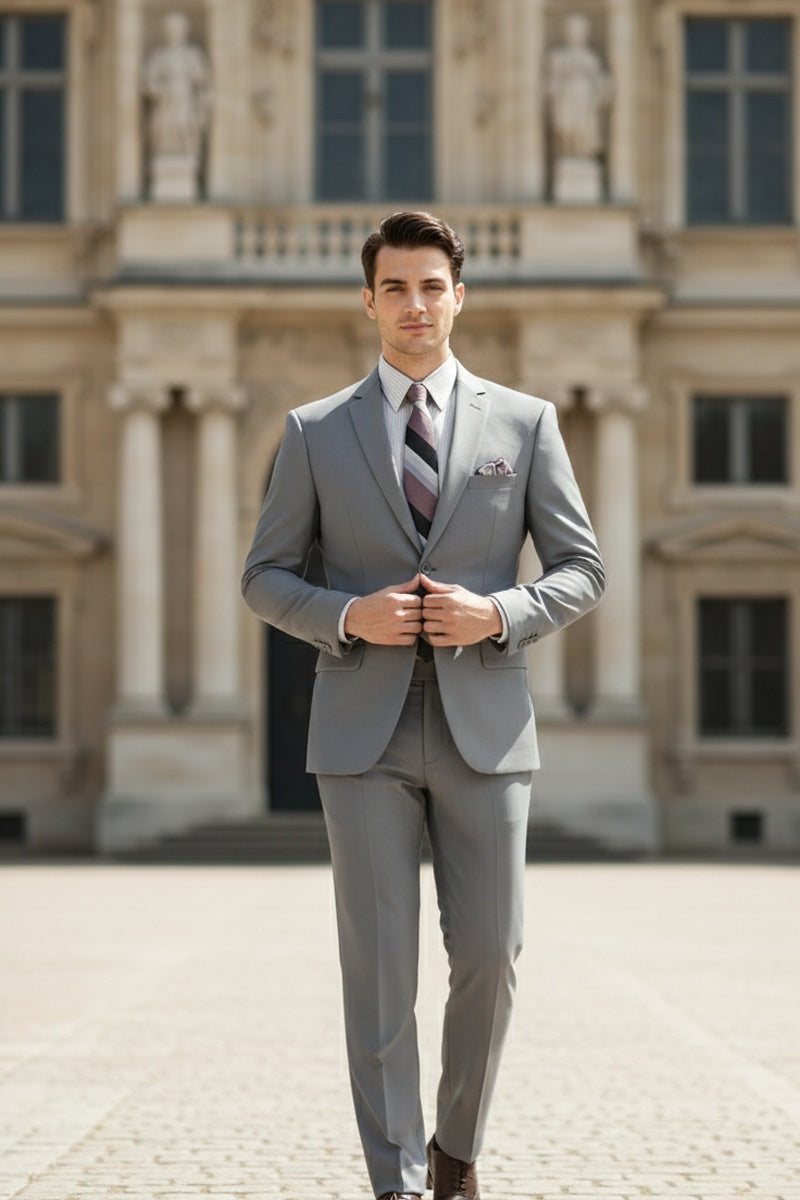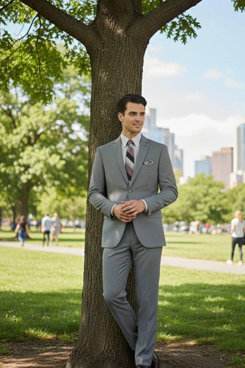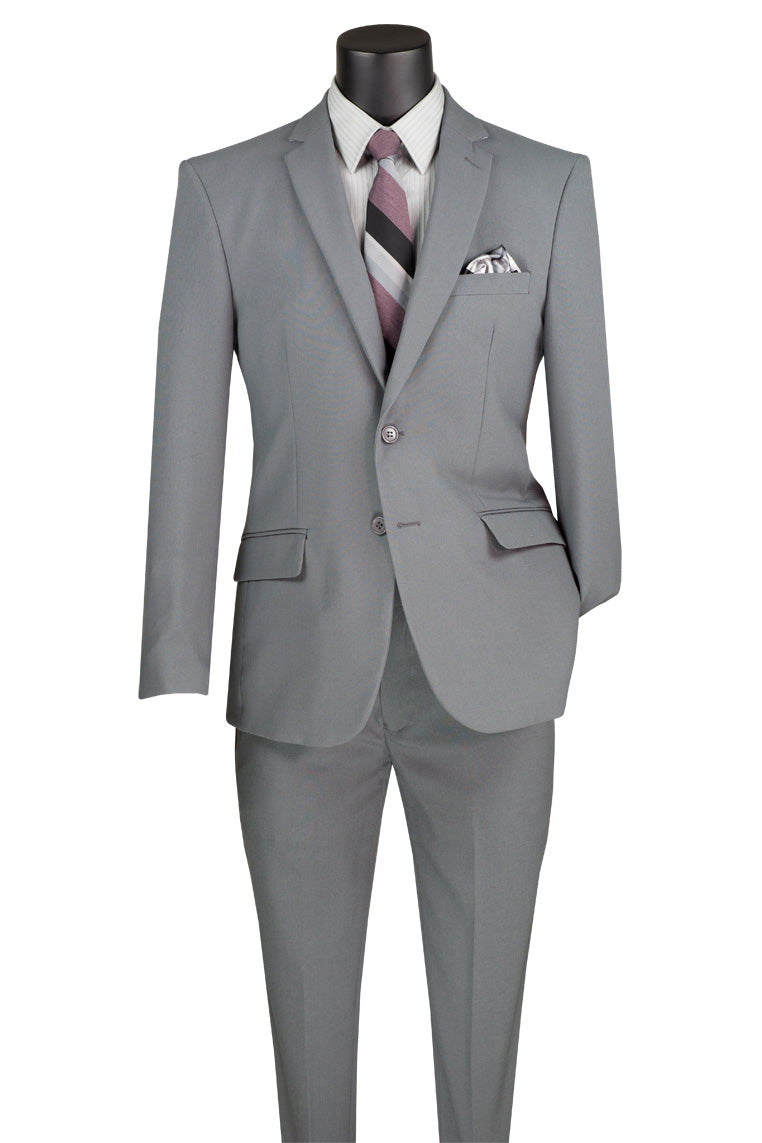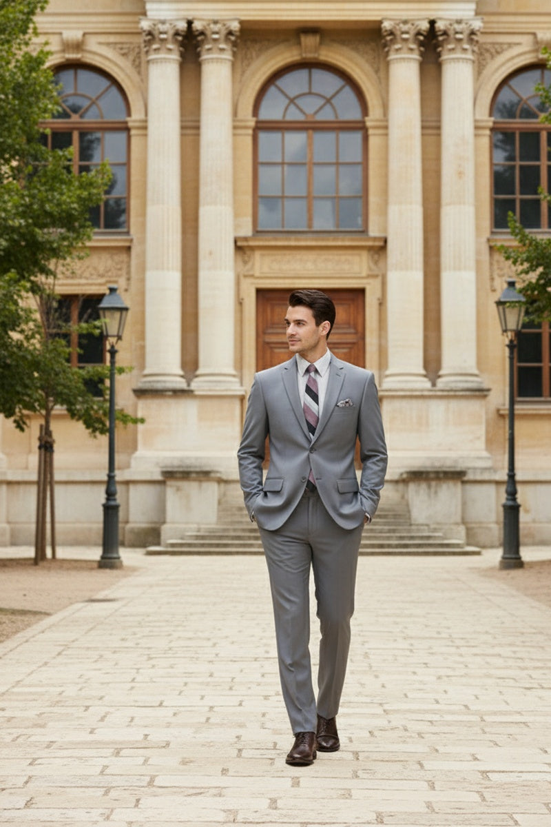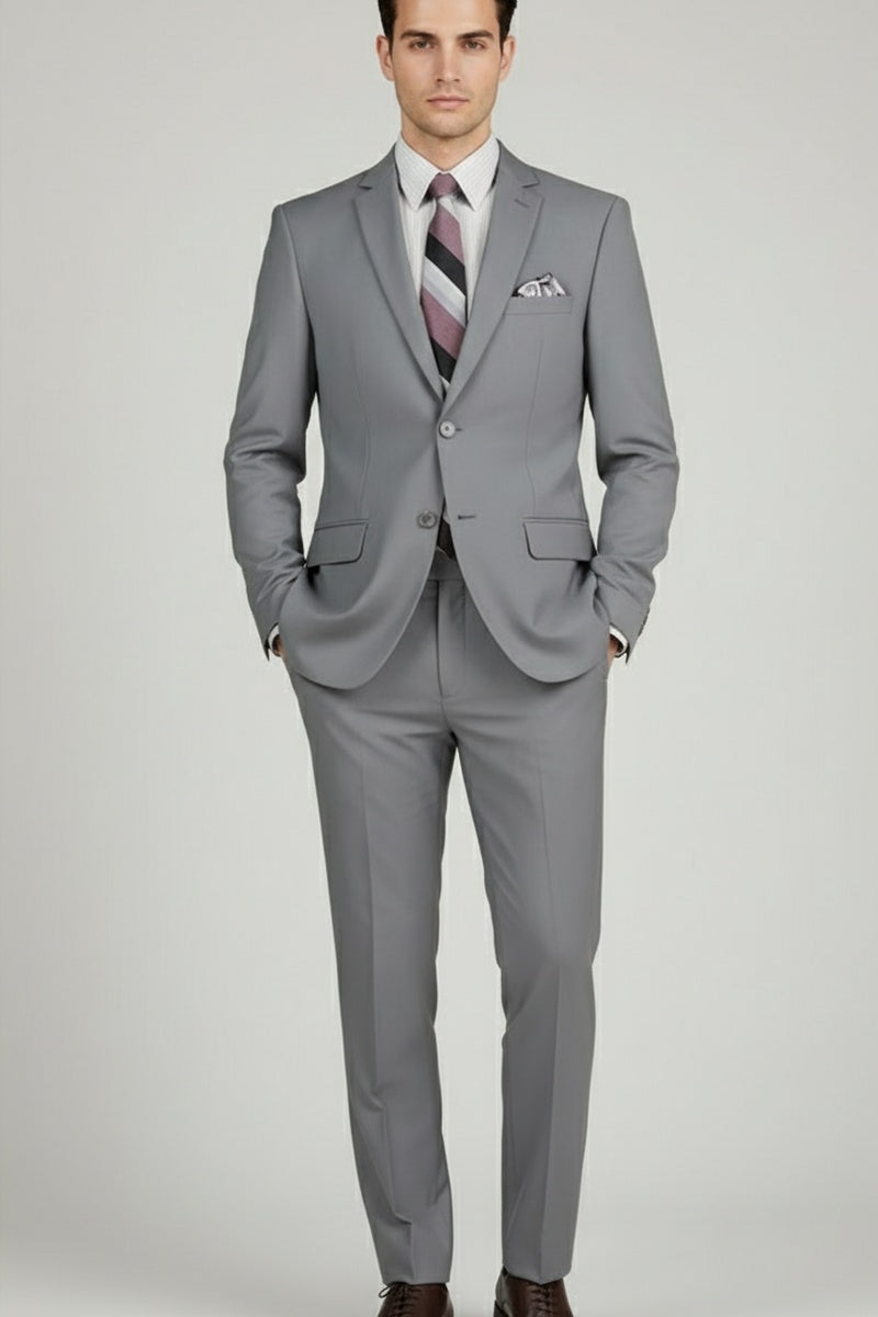 The Versafit Medium Grey Suit, designed by Vinci, is hand-tailored in a signature slim fit and crafted using a 100% poplin dacron fabric. The front of the jacket features notch lapels, two front buttons, and dual lower front besom pockets. A top welt pocket is located on the left side of the jacket to properly store a pocket square. Darts stitched down the front of the jacket are tailored to perfection giving a desired tapered shape to the garment. Towards the cuff of each jacket sleeve, there are vented sleeves for a more tailored, distinguished look. As we rotate towards the back of the jacket, we notice dual side vents providing a modern, updated look. Lastly, let's not forget the interior of the jacket. Silky soft interior lining complemented with plenty of pocket storage provides an ultra comfortable formal wear experience.