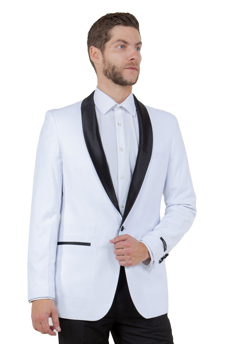 The "Chadwick" White Tuxedo, designed by Azzuro, is hand-tailored in a signature slim fit and crafted using a Super 150's luxury viscose blend fabric. The relatively high thread count of this viscose blend fabric ensures a soft, luxurious feel that one would expect from Azzuro. The front of the jacket features shawl lapels which are detailed in a black premium satin. The front enclosure features one button wrapped in coordinating black satin fabric while the dual lower front besom pockets, highlighted in the same black satin fabric, unify the look. A top welt pocket is located on the left side of the jacket to properly store a pocket square. Darts stitched down the front of the jacket are tailored to perfection giving a desired tapered shape to the garment. Towards the cuff of each jacket sleeve, there are vented sleeves with satin-faced buttons once again showing that no details were overlooked in design. As we rotate towards the back of the jacket, we notice dual side vents providing a modern, updated look. Lastly, let's not forget the interior of the jacket. Silky soft interior lining complemented with plenty of pocket storage provides an ultra comfortable formal wear experience.
