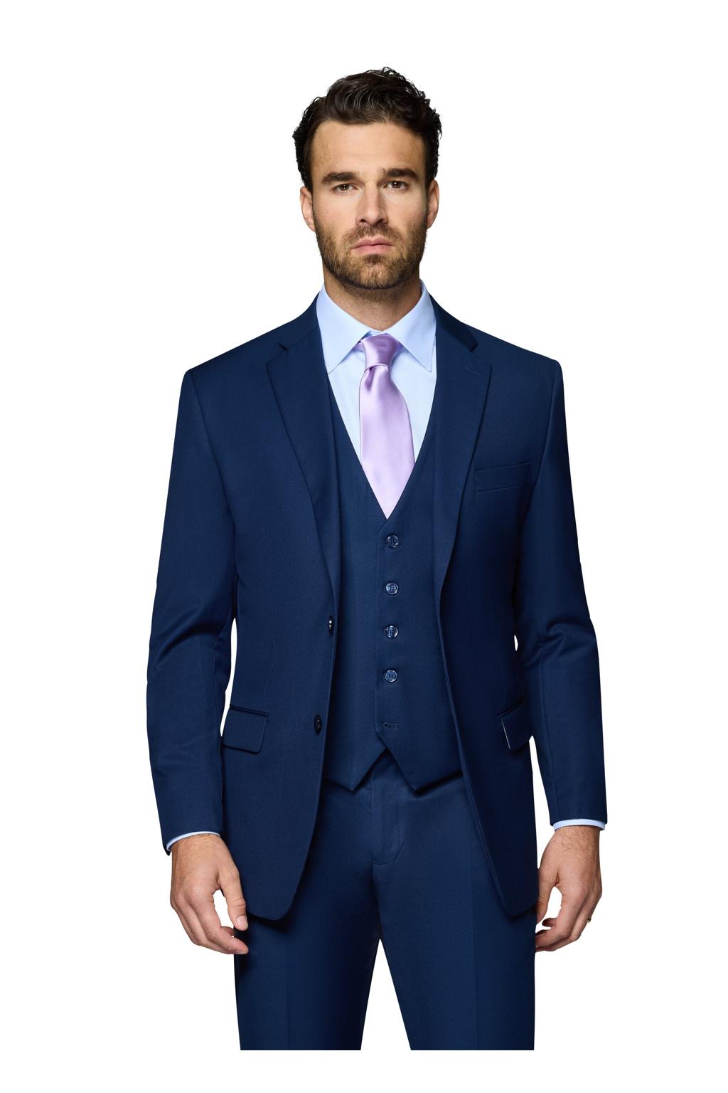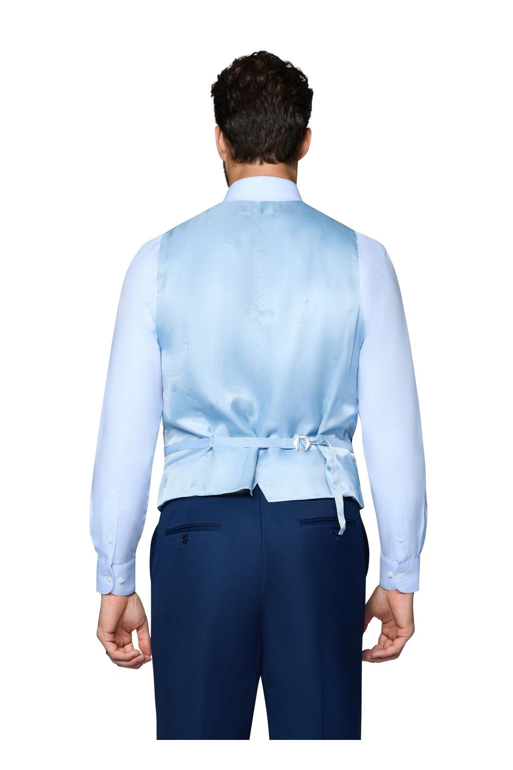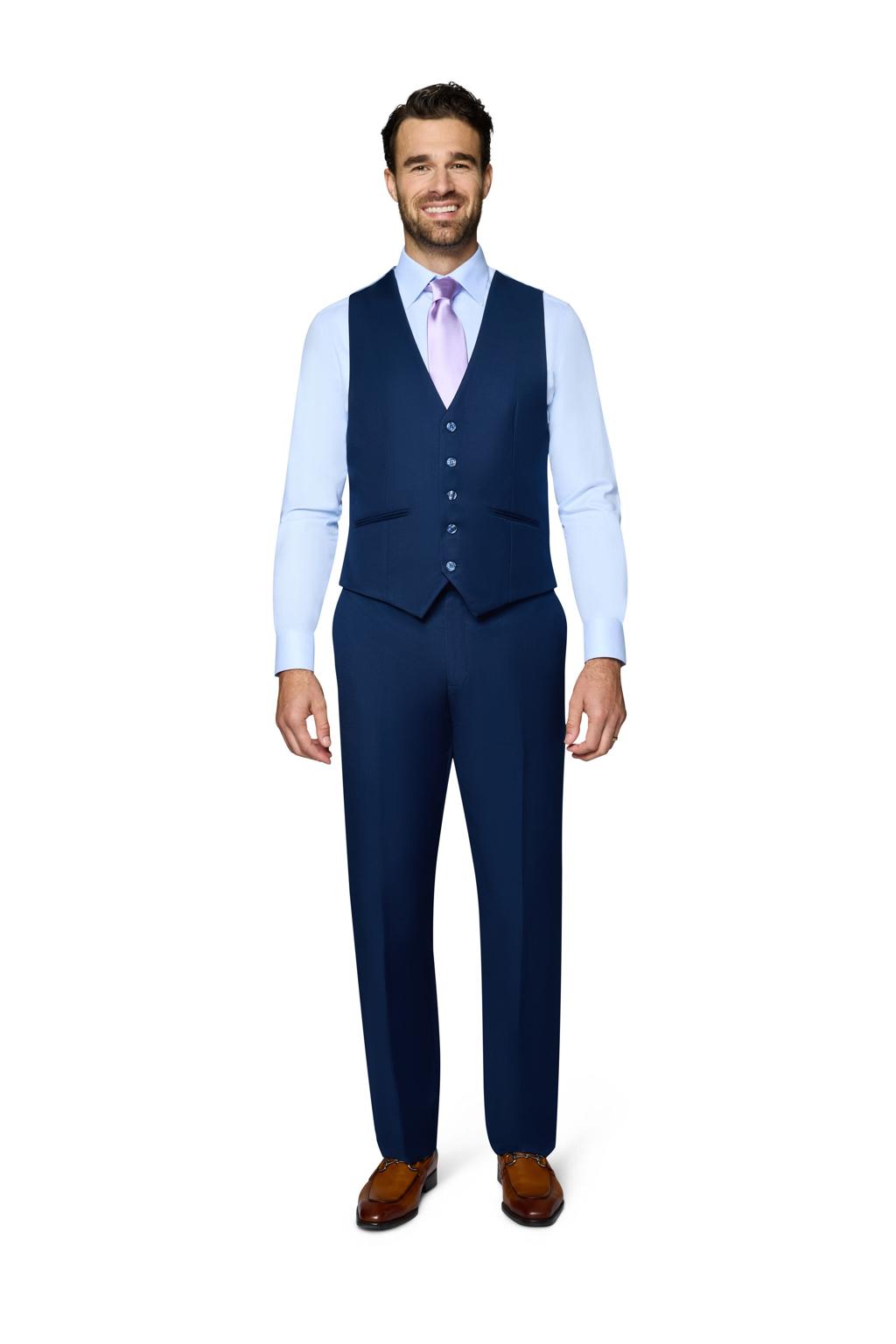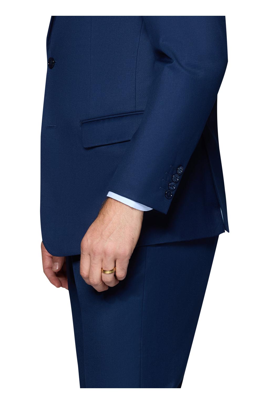 The "Ashford" New Blue Men's Suit, designed by Bergamo Elegant, is hand-tailored in a signature modern fit or slim fit and crafted using a Super 150's luxury viscose blend fabric. The relatively high thread count of this 100% viscose blend fabric ensures a soft, luxurious feel that one would expect from Berragamo. The front of the jacket features notch lapels with a two button front enclosure. A top welt pocket is located on the left side of the jacket to properly store a pocket square. Darts stitched down the front of the jacket are tailored to perfection giving a desired tapered shape to the garment. Towards the cuff of each jacket sleeve, there are vented sleeves with satin-faced buttons once again showing that no details were overlooked in design. As we rotate towards the back of the jacket, we notice dual side vents providing a modern, updated look. Lastly, let's not forget the interior of the jacket. Silky soft interior lining complemented with plenty of pocket storage provides an ultra comfortable formal wear experience.