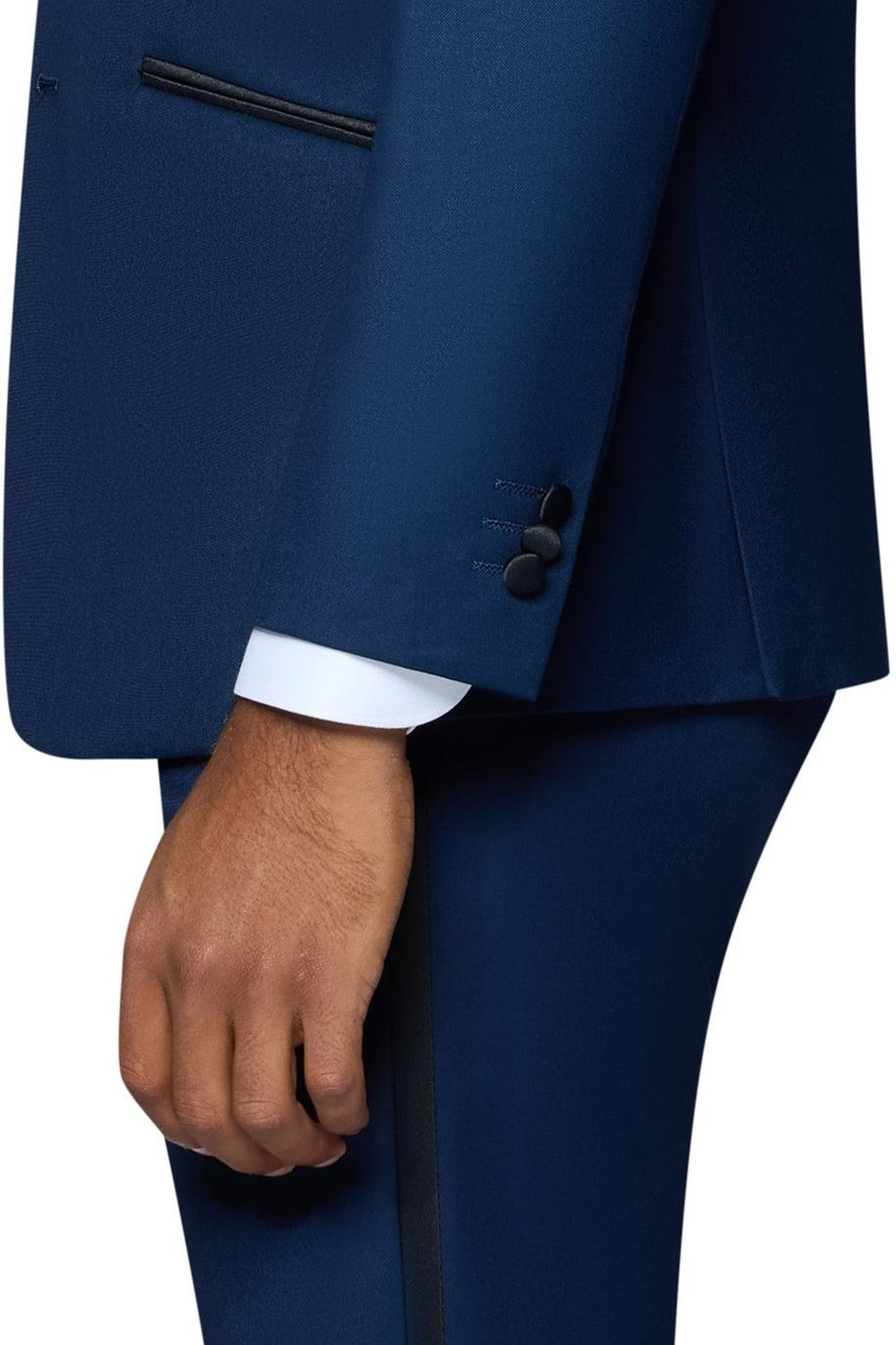 The "Pembroke" New Blue Tuxedo, designed by Bergamo Elegant, is hand-tailored in a signature modern fit or slim fit and crafted using a Super 150's luxury viscose blend fabric. The relatively high thread count of this 100% viscose blend fabric ensures a soft, luxurious feel that one would expect from Berragamo. The front of the jacket features notch lapels which are detailed in a black premium satin. The front enclosure features one button wrapped in coordinating black satin fabric while the dual lower front besom pockets, highlighted in the same black satin fabric, unify the look. A top welt pocket is located on the left side of the jacket to properly store a pocket square. Darts stitched down the front of the jacket are tailored to perfection giving a desired tapered shape to the garment. Towards the cuff of each jacket sleeve, there are vented sleeves with satin-faced buttons once again showing that no details were overlooked in design. As we rotate towards the back of the jacket, we notice dual side vents providing a modern, updated look. Lastly, let's not forget the interior of the jacket. Silky soft interior lining complemented with plenty of pocket storage provides an ultra comfortable formal wear experience.
